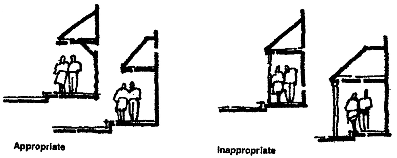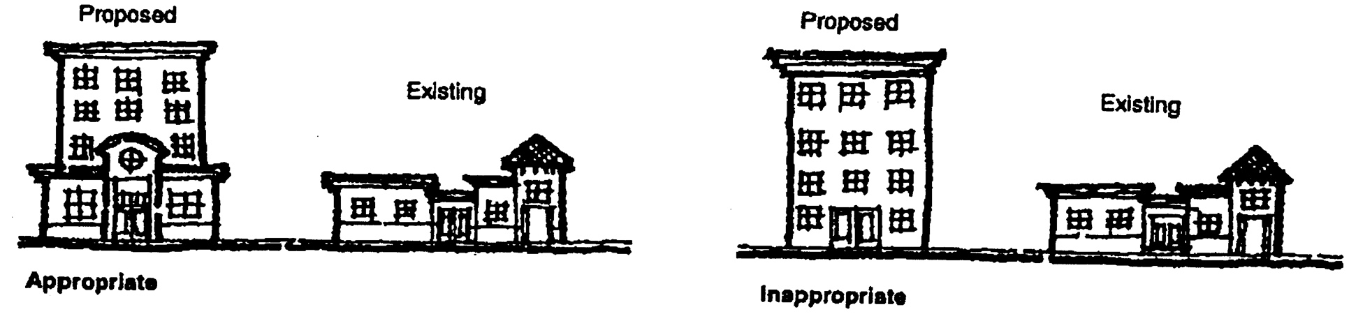 Scale. New structures shall relate to the form and scale of surrounding architecture. Buildings taller than two stories shall be evaluated as to their visual impacts upon adjacent structures and/or properties.