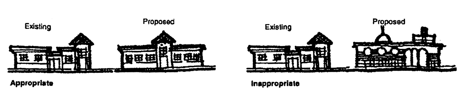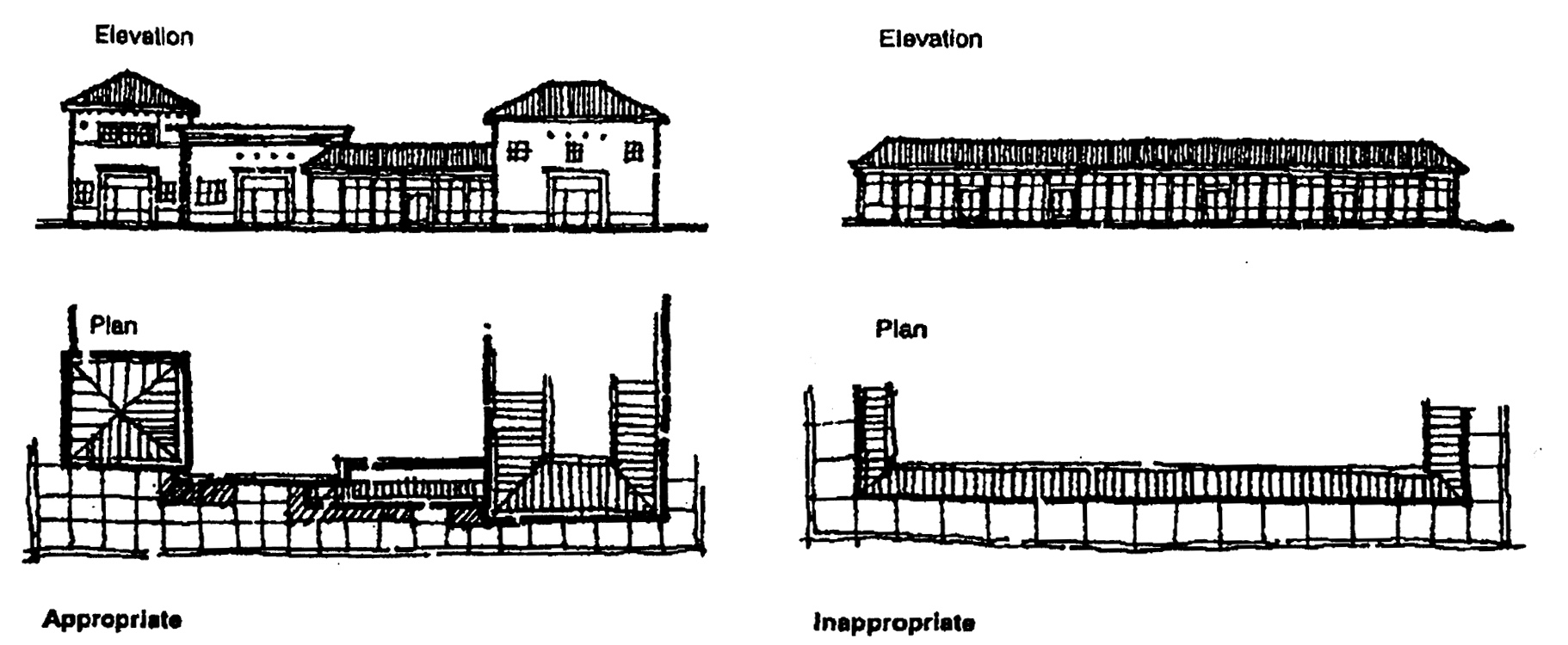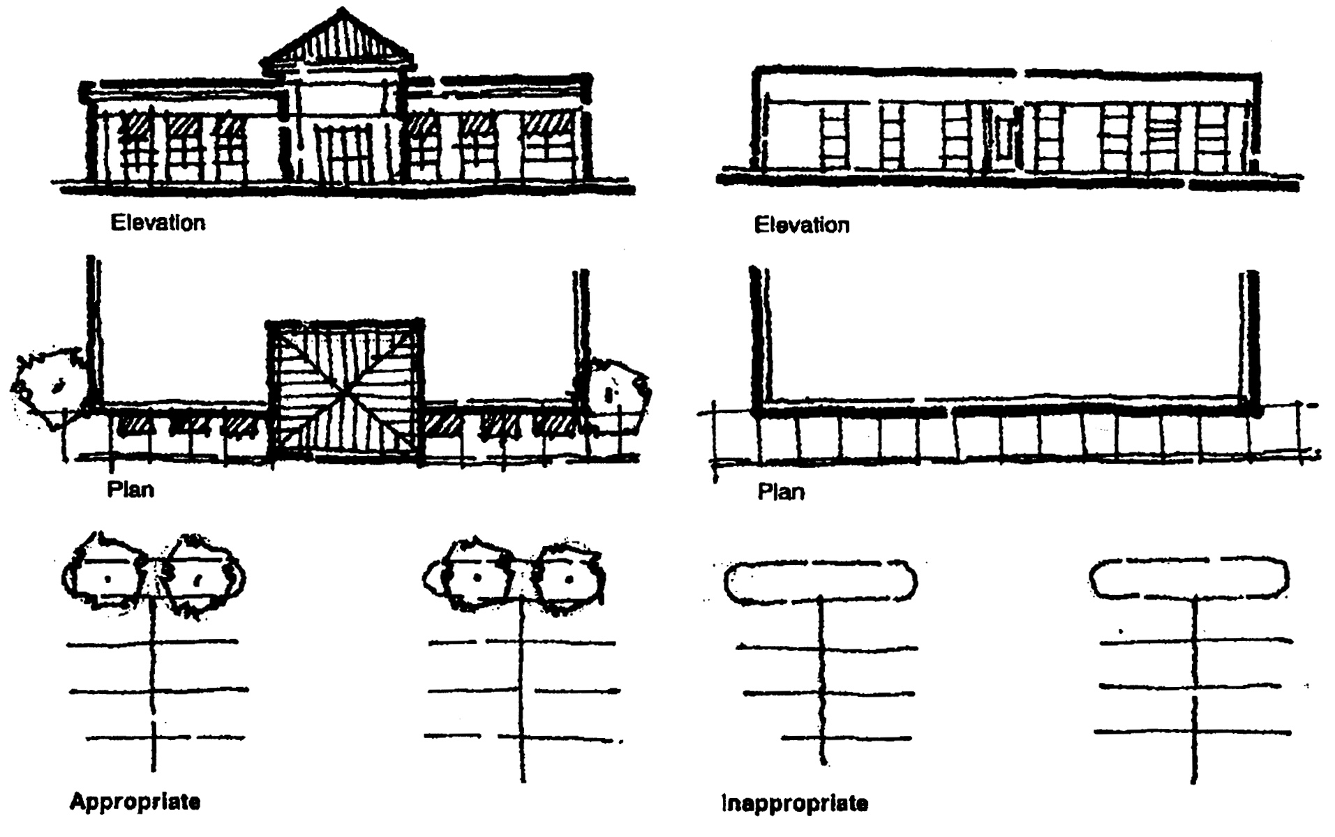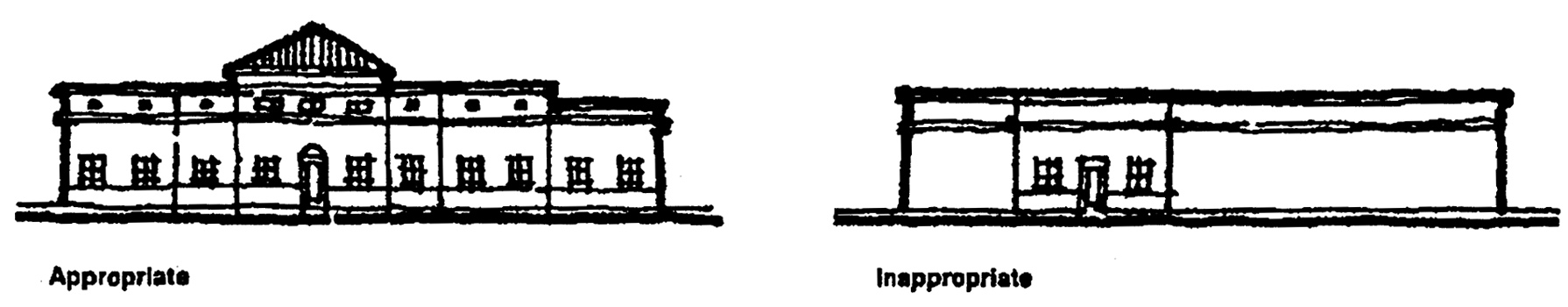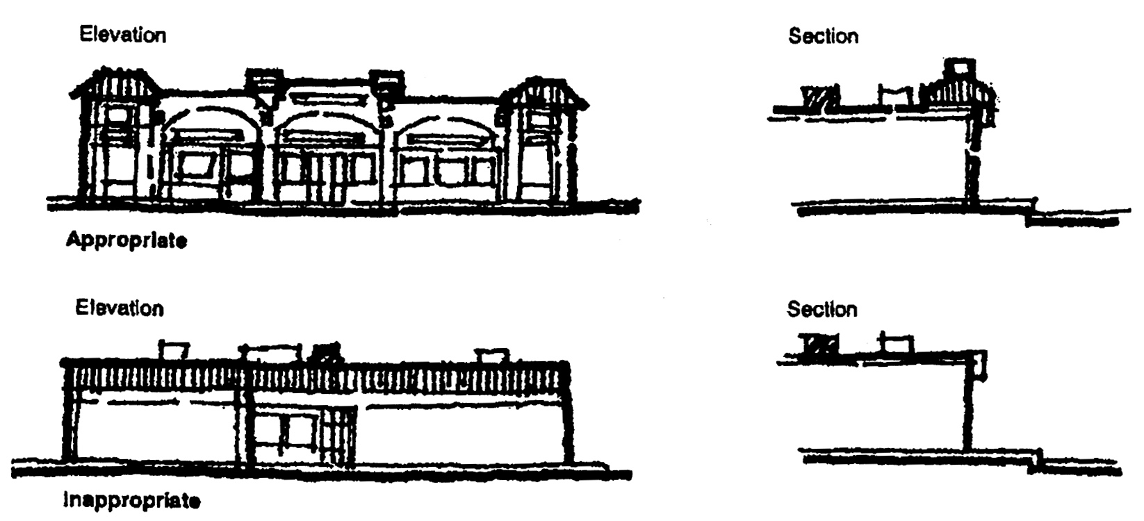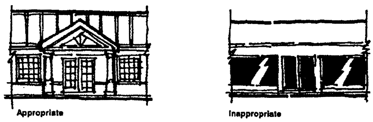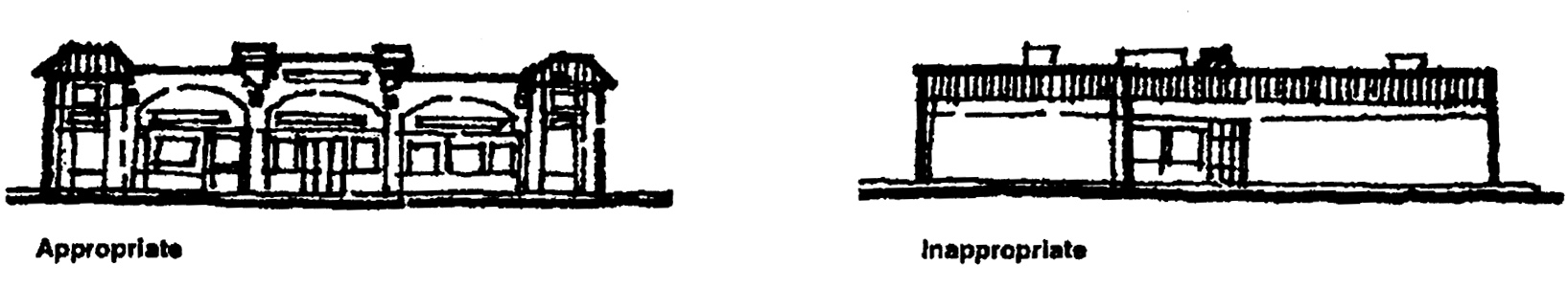 Illustrative architectural elements. The drawings located in Figure A [Facades] depict architectural elements that are both appropriate and inappropriate. These drawings are included in this article for illustrative purposes only to demonstrate the design intent of this article. The drawings are not intended to suggest any specific architectural design.