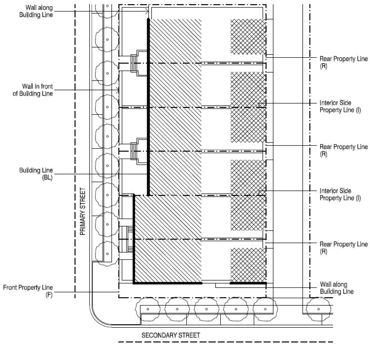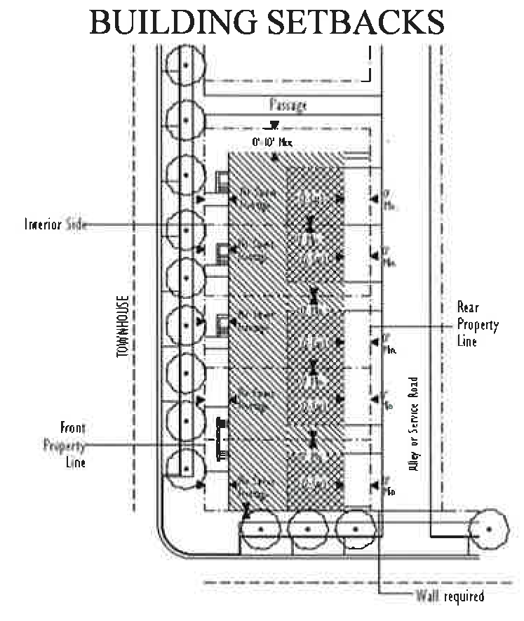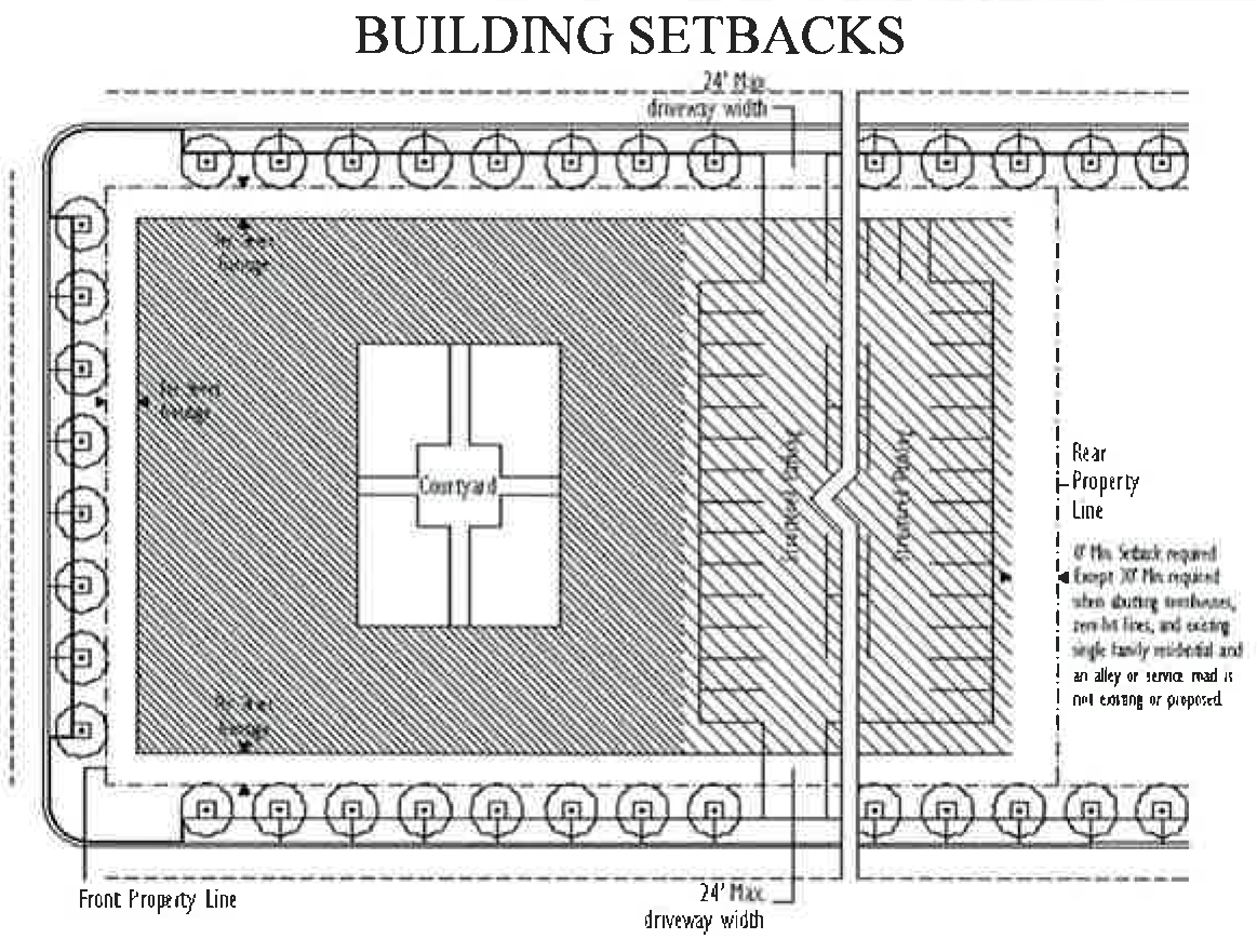 Setbacks and building frontage. The interior side and rear side setback standards specified on the building typology and placement regulating diagrams found in Appendix A of the MU (section 78-83.Appendix-A) shall apply. In addition, the following shall also apply in the FHMUDO: