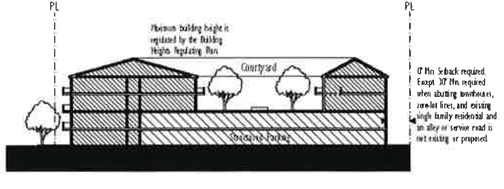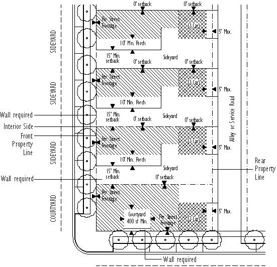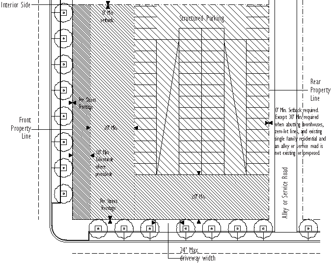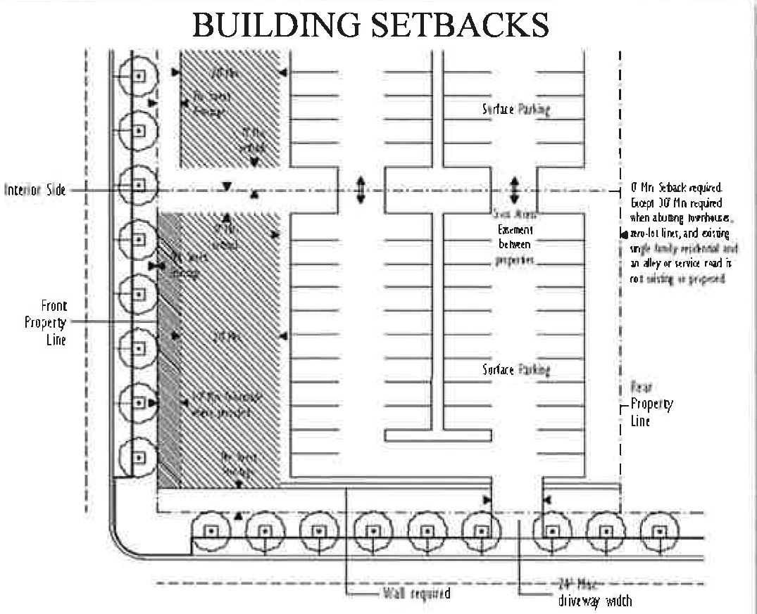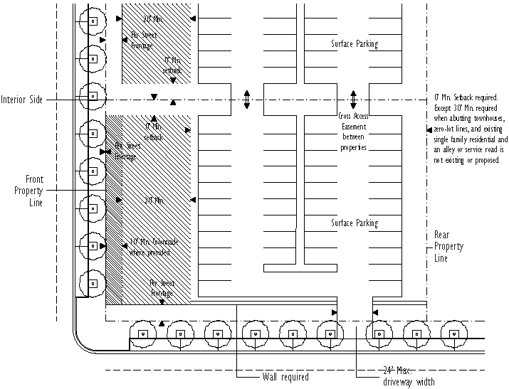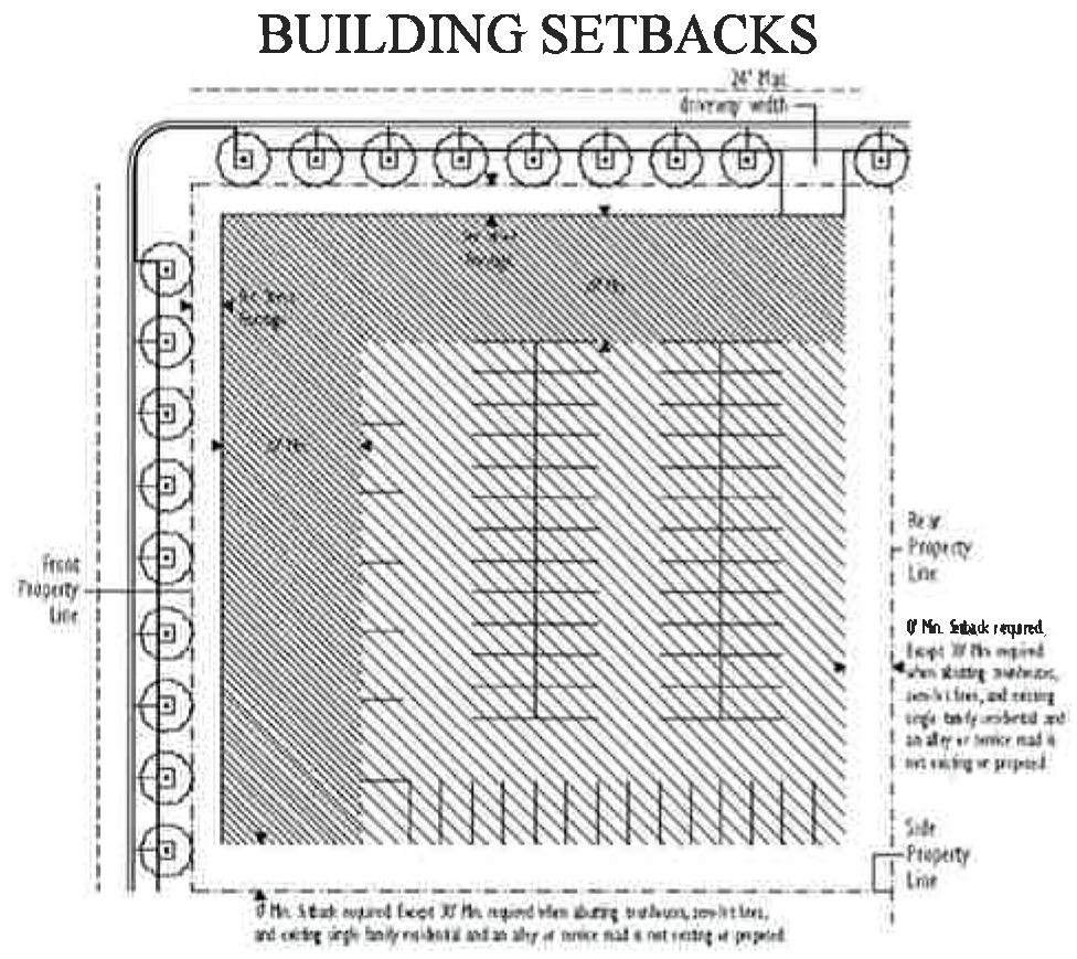 The minimum and maximum front and street side setbacks and the minimum percentage of building frontage required is based on the street type designation as shown on the street network connectivity regulating plan found in Appendix A, Figure 2 of this code section.