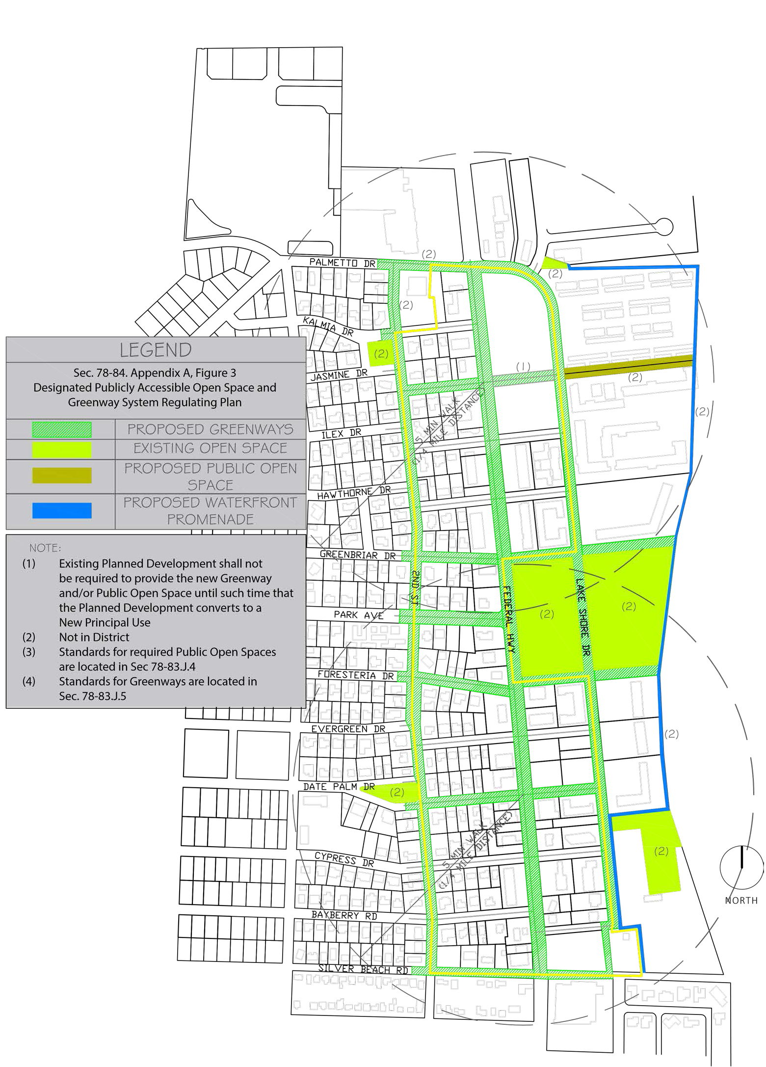 The designated publicly accessible open space and greenway system regulating plan. The designated publicly accessible open space and greenway system regulating plan is intended to designate the approximate location of the existing public open spaces around the district and the new designated publicly accessible open spaces and greenway system which shall be shown in all development plans. The designated publicly accessible open space and greenway system regulating plan is found in Appendix A of this code section as Figure 3. Standards for open spaces and greenway systems are found in subsection (j) of the MU district (section 78-83).