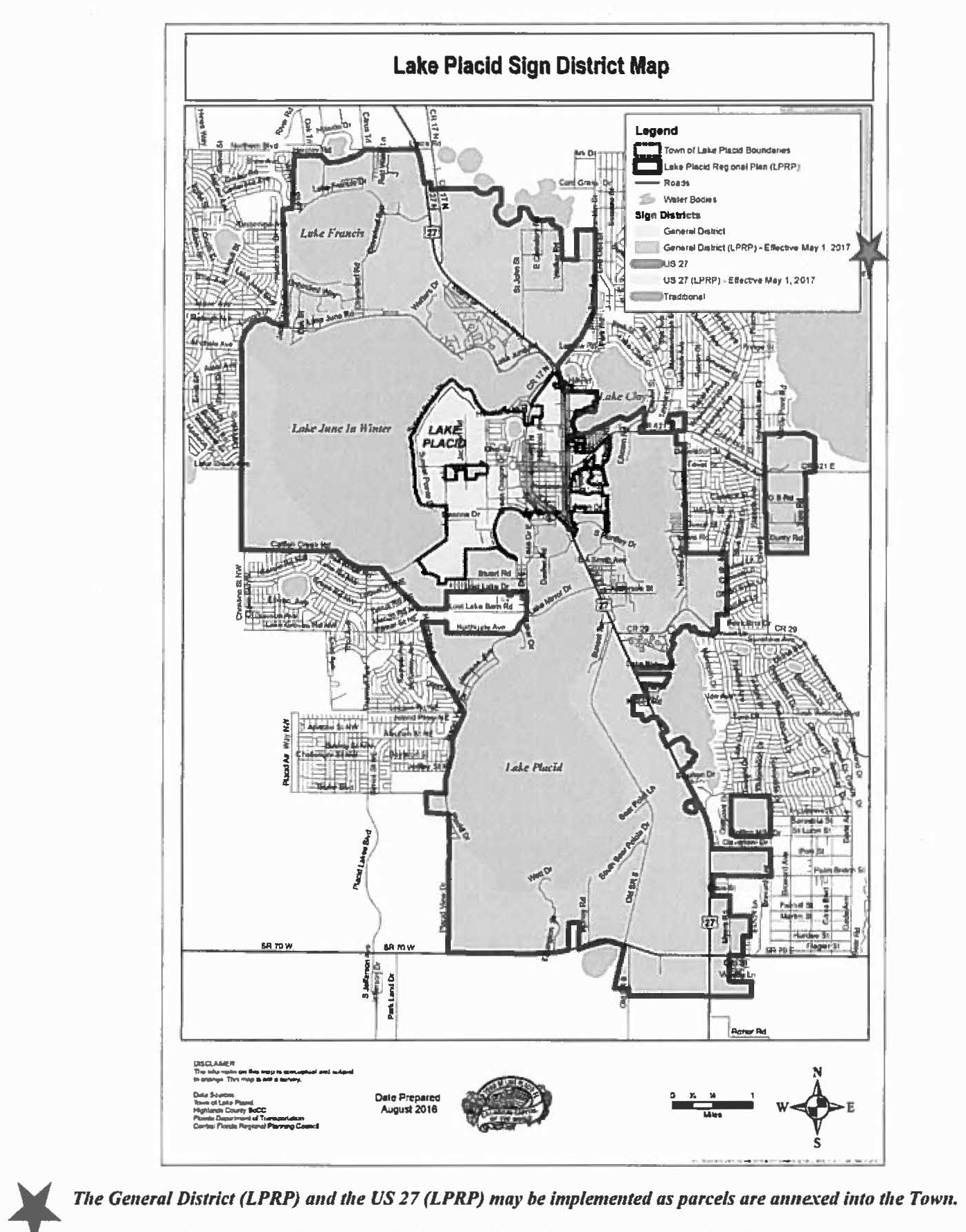 This section applies to development within the LPRP Overlay District, the boundaries which are shown on FLU Map 3, 2030 LPRP Growth Management Areas of the Lake Placid Future Land Use Map Series. The LPRP Overlay District is geographically described as including the lands on the Lake Wales Ridge bounded approximately by the State Road 70 corridor to the south, and near Lake Apthorpe and Lake Francis to the north. The major platted subdivisions, Placid Lakes, Leisure Lakes, Sun 'N Lake Estates, and Highlands Park Estates, are not included in the LPRP, but are considered for their potential affect on the LPRP Overlay District roadway network. Comprehensive plan future land use map amendments and zoning changes in place or in process, and ultimately approved, which establish land use greater than those established in this overlay district are not impacted by this overlay district relative to density; provided however, all other aspects of the overlay district apply.