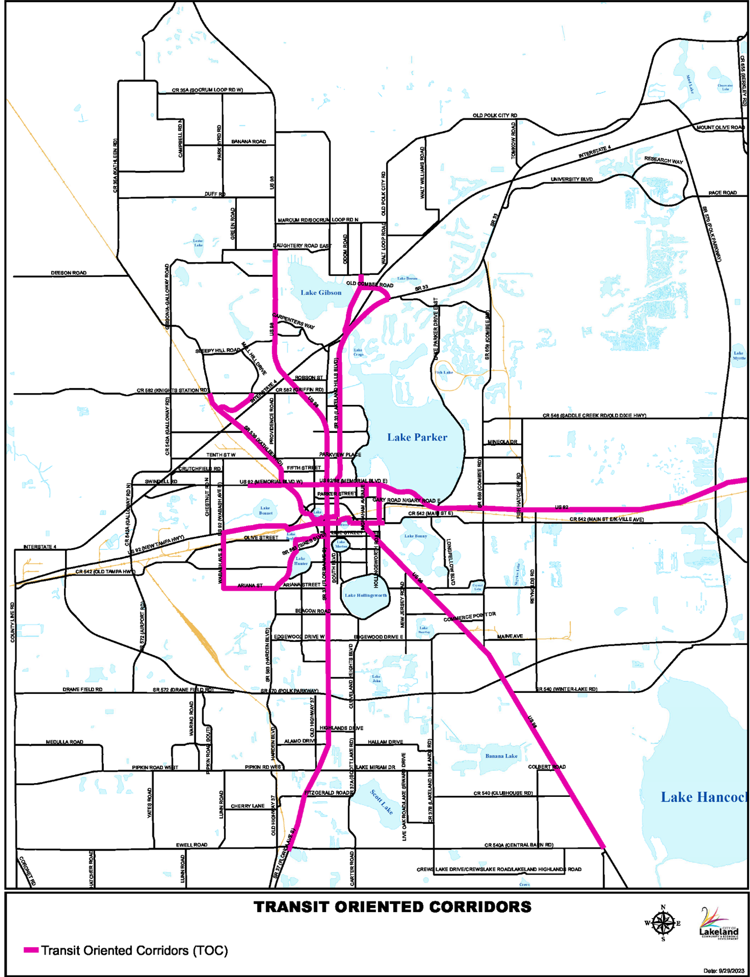 Transit Oriented Corridors (TOC): Corridors centered on certain streets identified in the Comprehensive Plan and illustrated in Figure 1.4-1 within which higher development densities are allowed due to existing and planned premium transit services including 30-minute frequencies, circulator routes with 30- or 60-minute frequencies, planned bus rapid transit services and/or connections to intermodal facilities such as bus terminals, train stations and park-and-ride lots. Roadway level-of-service standards are less stringent due to the presence of an extensive bicycle and pedestrian network, public transit service with frequencies generally 30 minutes or less and transit facilities.