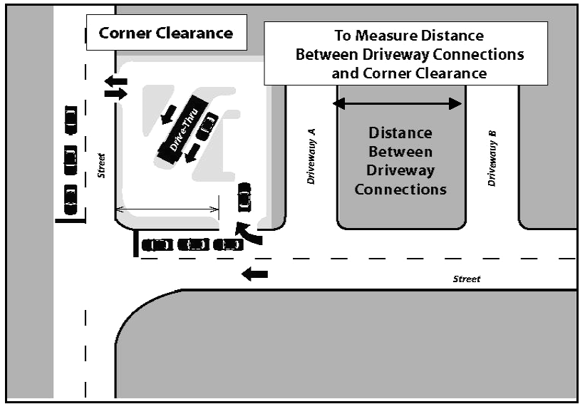 Corner Clearance: The distance from an intersection of a public or private road to the nearest connection along the public roadway. The distance is measured from the closest edge of pavement of the intersecting road to the closest edge of the pavement of the connection. The projected future edge of pavement of the intersecting road should be used, where available. (See Figure 4.2-1.)