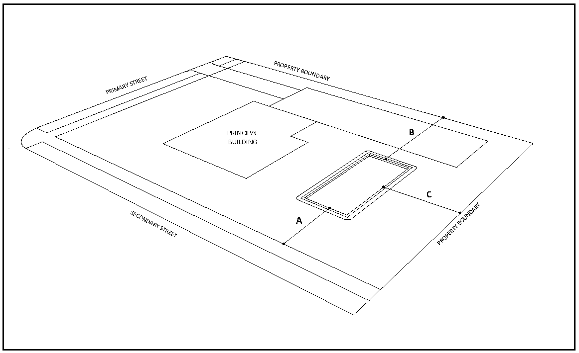 Beginning where the edges of the pavement of the intersecting streets meet at the corner, or in the case of rounded corners, the point at which they would meet without such rounding, thence 45 feet along one edge of pavement, thence diagonally to a point along the edge of pavement of the intersecting street 45 feet from the point of beginning, thence to the point of beginning. In the case of rounded corners having a radius larger than 45 feet, both legs of the triangle at the edge of pavement shall be equal to the radius. Example: For a corner radius of 55 feet, both legs shall be 55 feet.