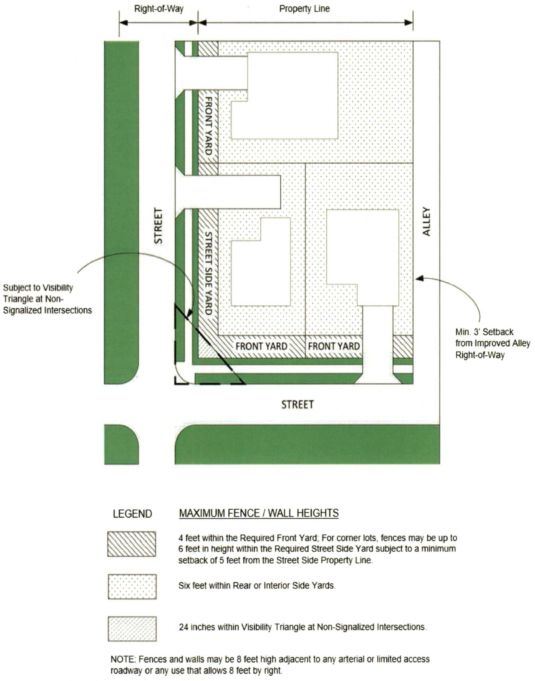 Example 1: If only a section of a nonconforming fence is replaced, only that section of the fence must meet the standards and requirements for fences.