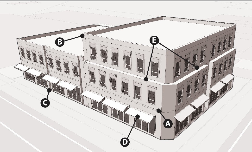 Architectural elements means physical features that relate to building architecture and character such as, but not limited to: