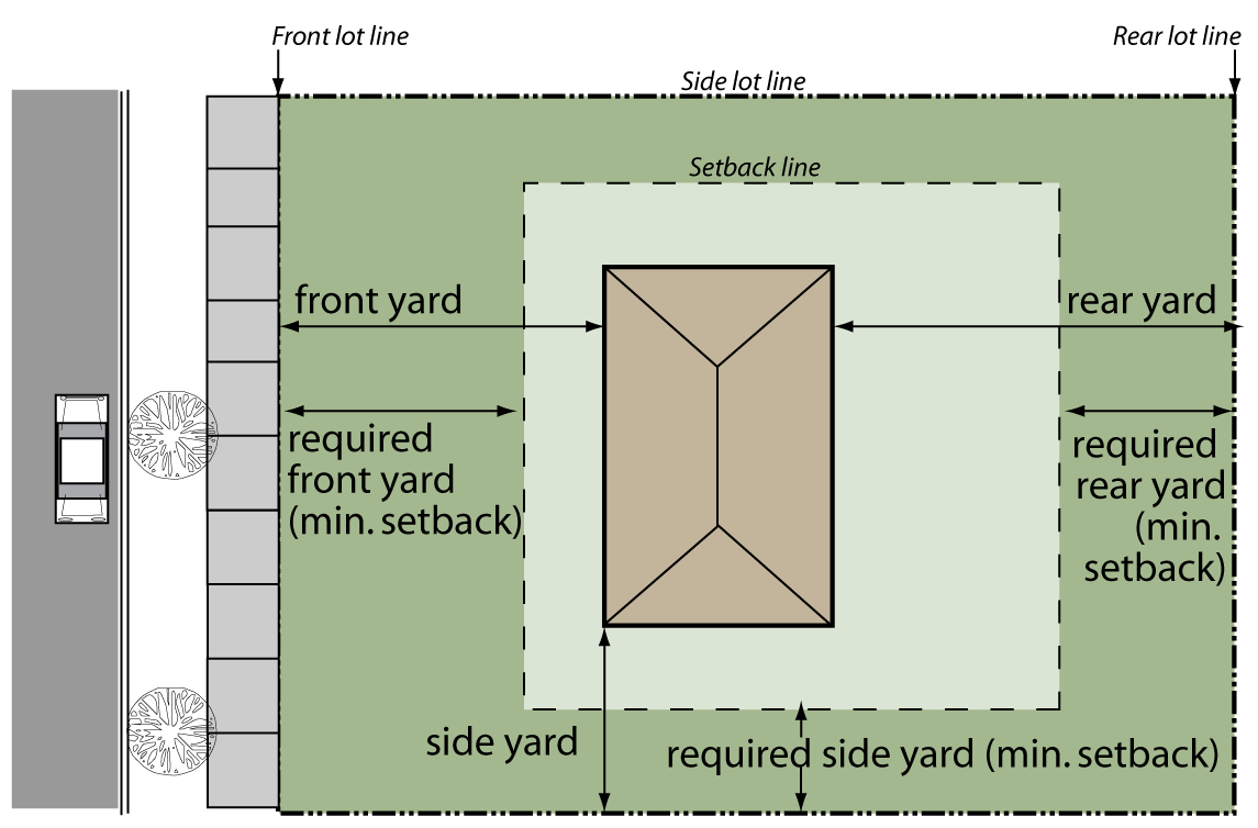 Setback means the minimum horizontal distance measured from the lot line, as required under this ordinance, for the front, side, or rear property line as appropriate.