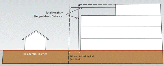 Upper floor step backs means for the elevation adjacent to a residential district (R-1, R-2, R-3, and R-MX), the floors above the third story shall be tiered-back so that the highest point of the building is setback from the adjacent residential district a distance at least equal to the height of the building.