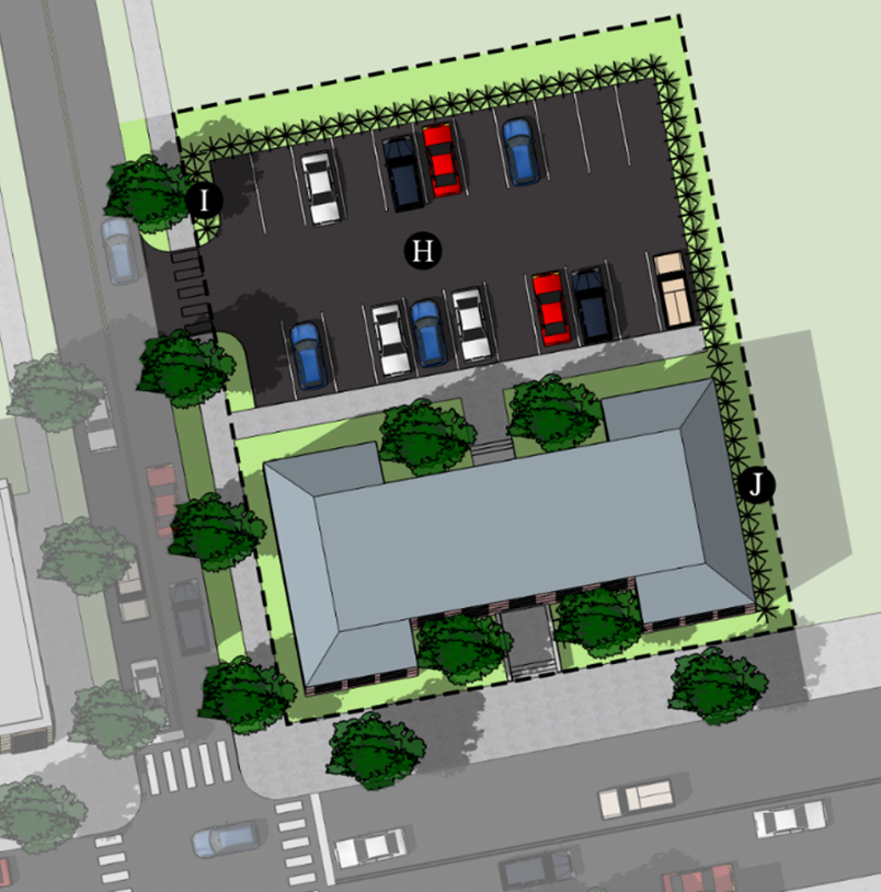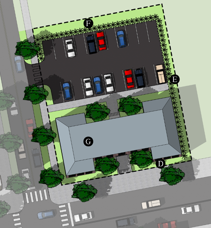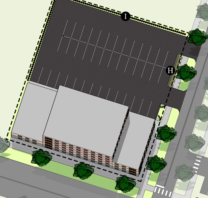 Additional landscape elements. Exceeding minimum quantities or sizes required in Chapter 1252 - Landscaping with native species and larger caliper plantings. Or additional plantings or decorative fence or wall where needed to help reduce impacts on neighboring properties.