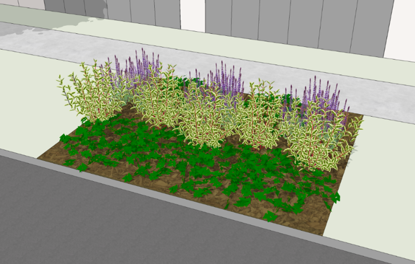 A landscape planting bed is that area comprised of trees, evergreen shrubs, living plant ground covers, perennials/annuals, or a combination thereof, which may be delineated by wood chips, mulch, decorative pavers, and/or rocks.