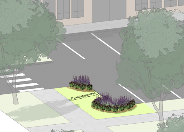 To protect stormwater drains from debris, landscaping rocks and mulch must be properly contained on site and may only be installed as weed control directly around plants. Non-plant material shall not exceed 25 percent of the parking lot island surface area.