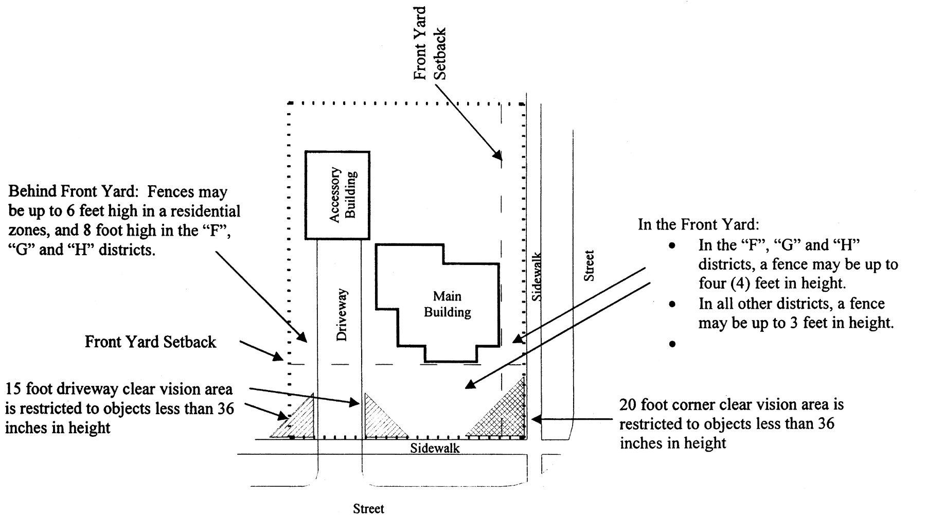 No fence, wall, planting screen or accessory structure greater than 36 inches in height as measured from grade, shall be located within a triangular section of land formed by two 15-foot perpendicular lines intersecting at the driveway and the right-of-way line and a connecting line.