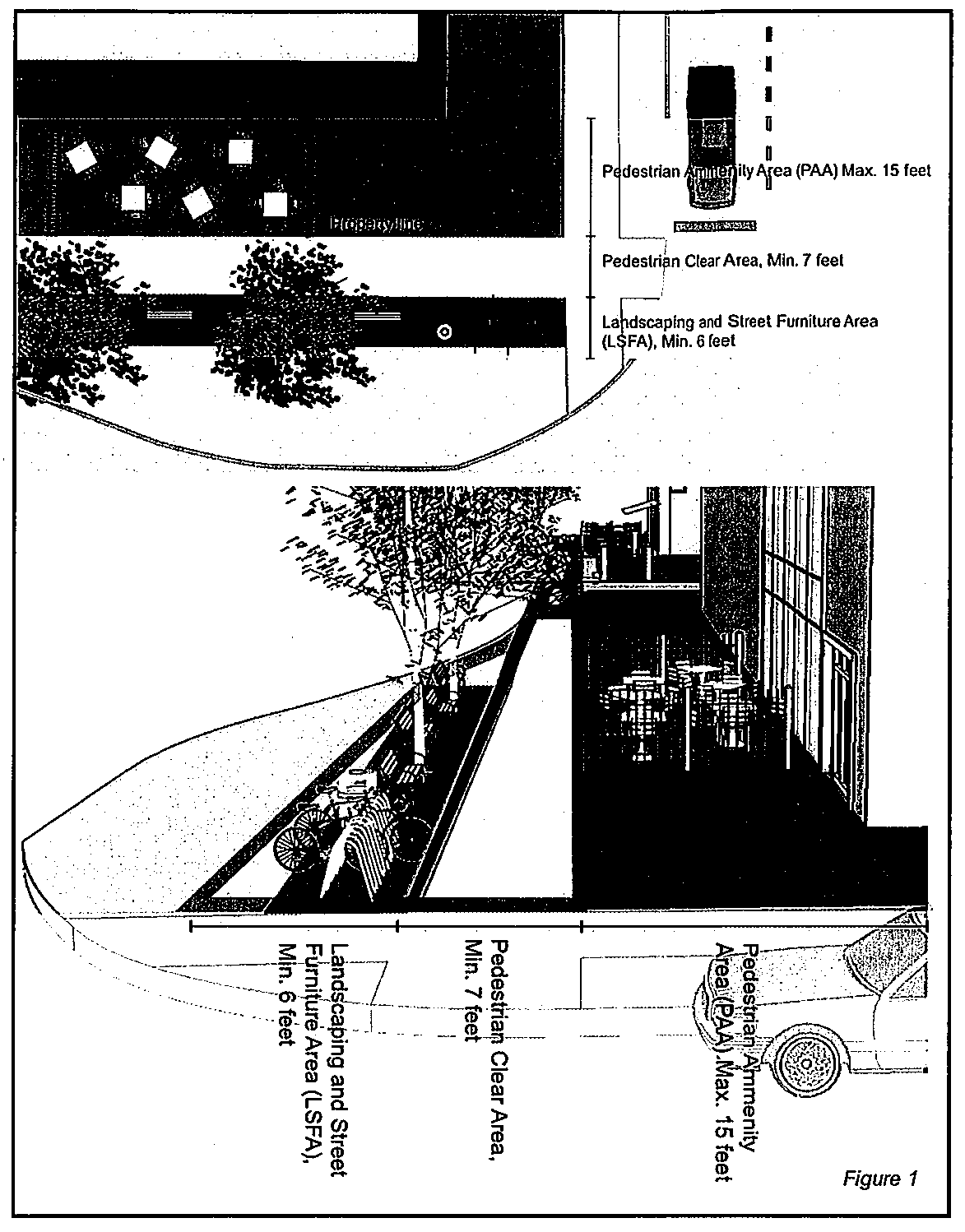 Pedestrian zone. The roadside (the area between a building's façade and the face of the road pan curb) is composed of a pedestrian zone (PZ) and an optional pedestrian zone amenity area (PZAA). The pedestrian zone shall consist of an unobstructed, pedestrian clear area (PCA) and landscaping and street furnishings area (LSFA) (see figure 1).