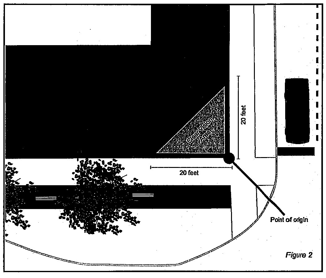 A clear vision triangle (see figure 2) shall be maintained where roads, whether public or private, intersect, and whether there is traffic control or not. The clear vision triangle shall be determined using one of the following methods:
