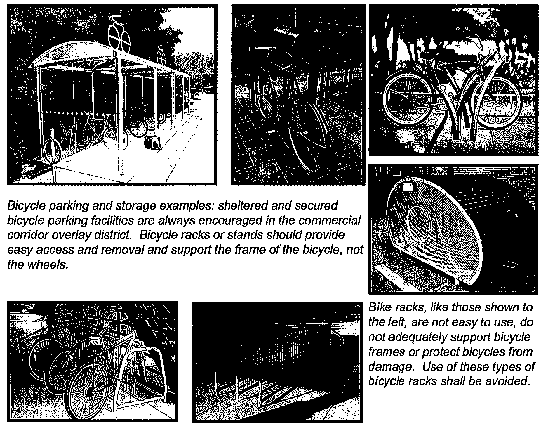 Each space shall include a metal bicycle rack, stand, or similar device for securing bicycles with a user-supplied lock. Sheltered bicycle stalls or similar storage devices are strongly encouraged and may, at the discretion of the planning commission, be used to reduce total bicycle parking requirements for a site by as much as 50 percent of the original number required.