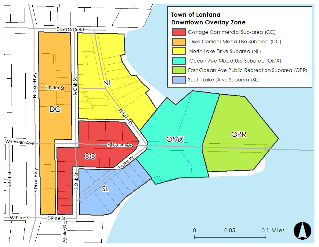 Downtown overlay zone (DOZ) and sub-areas. The boundaries of the downtown overlay zone are: Lantana Road on the north; Pine Street on the south; Intracoastal Waterway on the east; and Dixie Highway on the west.