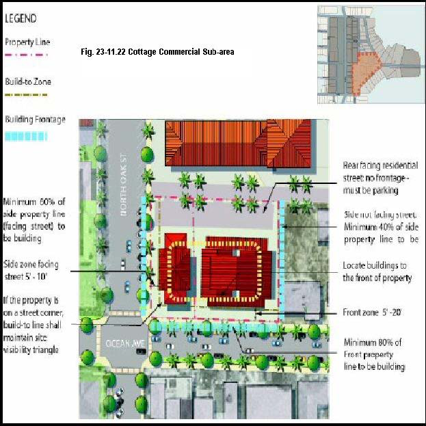 Cottage Commercial sub-area (CC)—A small-scale commercial area with retail shops, restaurants, offices with unique design criteria along Ocean Avenue between Oak Street and Lake Drive and including seven (7) lots south of Ocean Avenue on the west side of Oak Street;