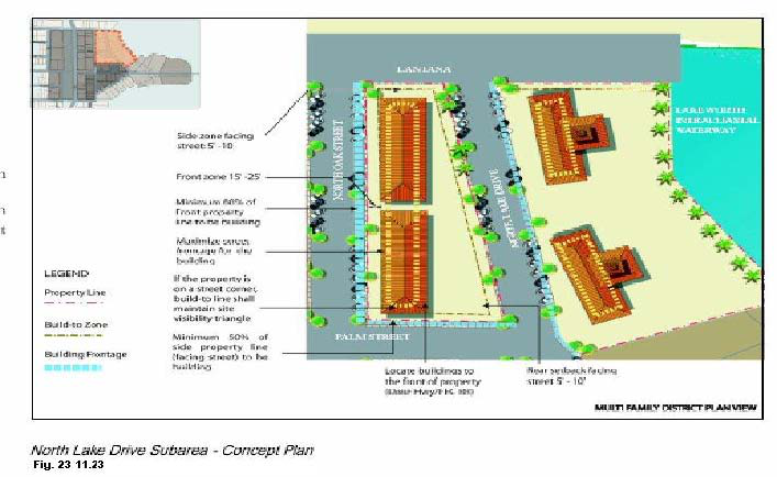 North Lake Drive sub-area (NL)—A multifamily area with design criteria along the East side of North Lake Drive and including eight (8) lots along the west side of North Lake and four (4) lots fronting on Oak Street, between the alley north of Ocean Avenue and Lantana Road;