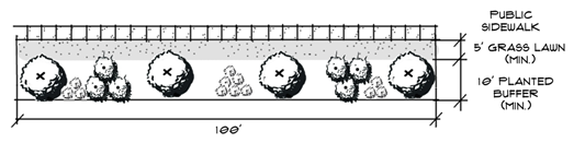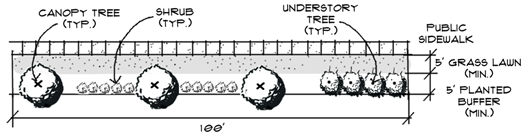 Typical treatment - A grass lawn shall be provided with a width of at least five (5) feet at the back of the public sidewalk, between the sidewalk and any required landscaping, including any shrubs, understory and canopy trees. This lawn area shall be kept clear of plantings other than sod and shall extend along the edge of interior driveways and walkways leading into the site from the street.