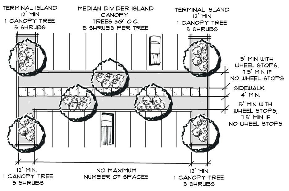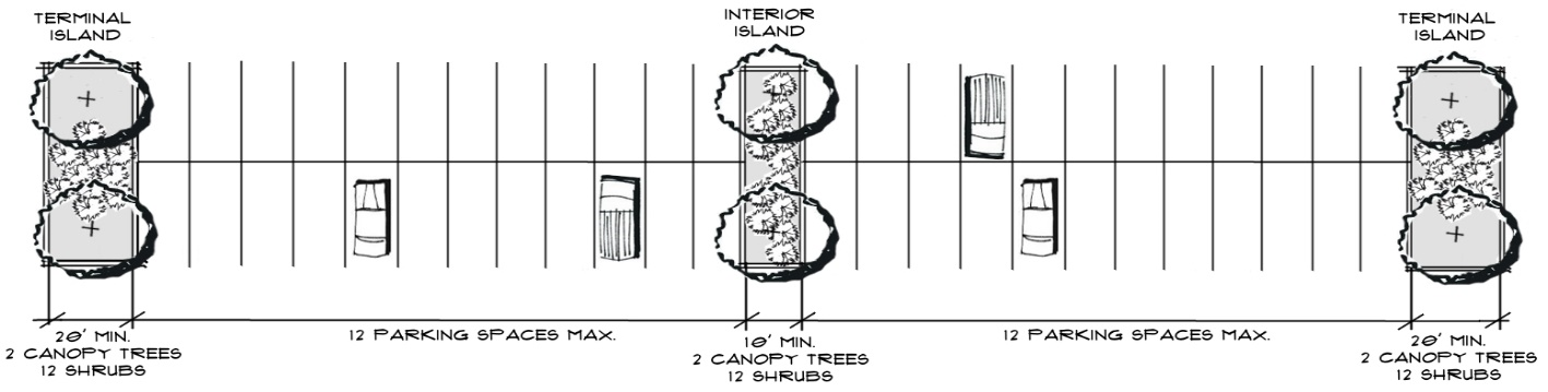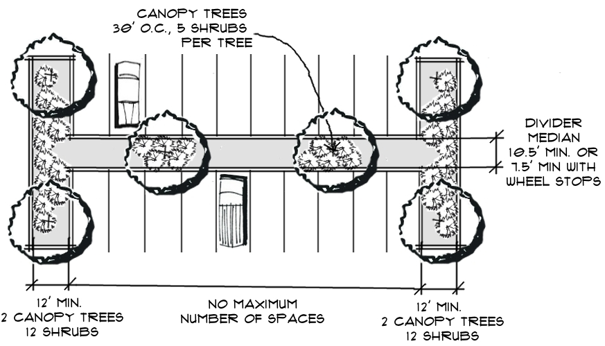 Landscape buffers adjacent to streets - Buffers adjacent to streets are required where buildings, parking, driveways, loading and trash facilities are adjacent to the right-of-way. All buffers shall either be Type A or B (see Figures 10-1 and 10-2);