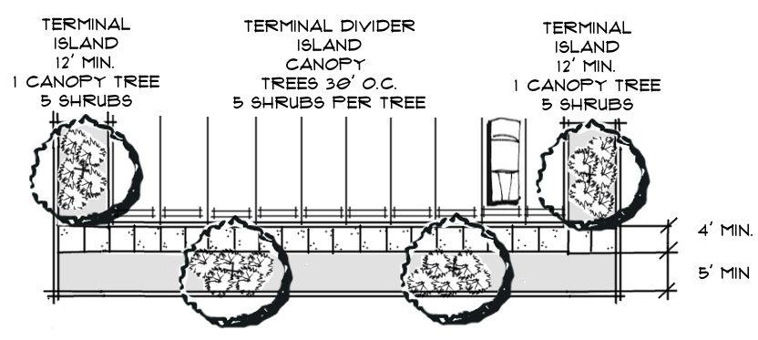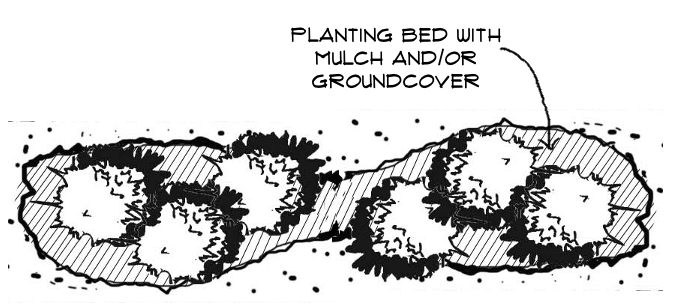 Landscape spacing - All trees must be spaced so as to attain their natural height and spread at maturity. Species that naturally grow in clusters may be grouped at a minimum of ten (10) feet on center. All other species of trees shall be installed at a minimum of fifteen (15) feet on center. Shrubs must be installed at a minimum of three (3) feet on center.