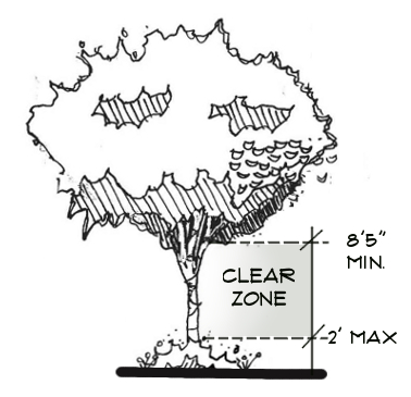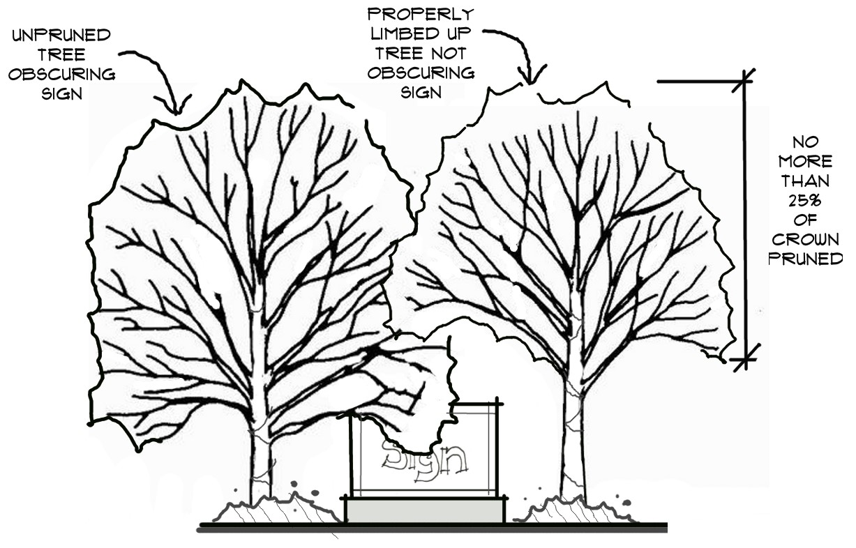 All trees may be pruned to maintain shape and promote their shade-giving qualities and to remove diseased or dying portions in areas where falling limbs could be a hazard to people or property. Tree pruning shall be done in accordance with the latest revision of the American National Standard for Tree Care Operations "Tree, Shrub and Other Woody Plant Maintenance" (ANSI A300) and "Pruning, Trimming, Repairing, Maintaining, and Removing Trees, and Cutting Brush—Safety Requirements" (ANSI Z133). No more than twenty-five (25) percent of the crown shall be removed at one time. In order that trees shall develop a healthy structure, no more than thirty-three (33) percent of the trunk of immature trees shall be left bare by limb removal. Also, the top branch or leader of immature trees shall not be removed. Hooks shall not be used to climb trees unless the tree is being taken down. Mature trees overgrowing vehicular use areas shall be pruned to allow the passage of emergency vehicles. Excessive pruning, hat racking or pollarding of trees into round balls of crown or branches, which results in an unnecessary reduction of shade and promotes weak branch attachments, shall be prohibited. Figure 10-21 provides graphic examples of permitted pruning practices. Trees pruned by utility providers within utility easements are not subject to this provision.