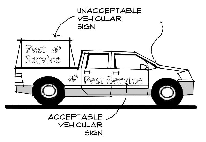 Signs that are permanently painted or wrapped on the surface of a vehicle, adhesive vinyl film affixed to the interior or exterior surface of a vehicle window, or signs magnetically attached to motor vehicles or rolling stock that are actively used in the conduct of the business (see Figure 12-1). Such vehicles must be parked on-premises in a lawfully designated parking space or an area authorized for outdoor storage. The vehicle must be operable and bear a current license plate or have a current registration. Prohibited vehicle signs are outlined under Section 12.6.2;