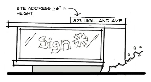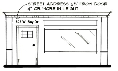 Numerals and lettering identifying the street address numbers that are necessary to assist emergency vehicle drivers and other motorists with identifying the location of properties within the City. All buildings and suites with multiple tenant buildings or complexes are required to display street address numbers that have been assigned in accordance with a method approved by the Authority Having Jurisdiction (AHJ). Assigned addresses shall not be changed unless approved by that AHJ. The display of approved street address numbers must be clearly visible from the right-of-way and shall be a minimum of four (4) inches high with a minimum stroke width of ½-inch in accordance with the Florida Fire Prevention Code (FFPC) adopted by the City of Largo and incorporated into the Largo City Code (Chapter 13, Article II, Section 13-19);