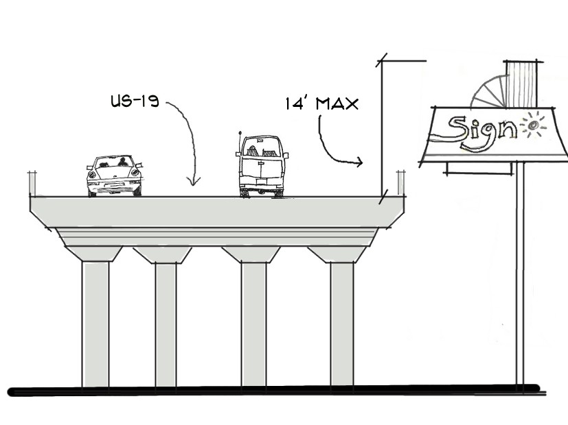 If the proposed freestanding sign is to be located on a parcel immediately adjacent to US Highway 19, a legal boundary survey must be submitted for the subject parcel depicting the highest point of US Highway 19 adjacent to the subject parcel(s)' property line(s). The highest point of US Highway 19 adjacent to the subject parcel(s) shall be measured as described in Section 12.9.5; and,