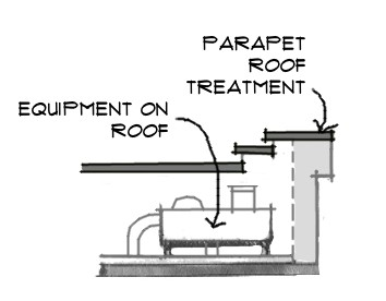 Roof treatments shall be designed to conceal flat roof lines, and rooftop equipment, i.e., heating, ventilating and air-conditioning units, from view from adjacent properties and rights-of-way through use of parapet walls or sloping roof planes (see Figure 13-1).