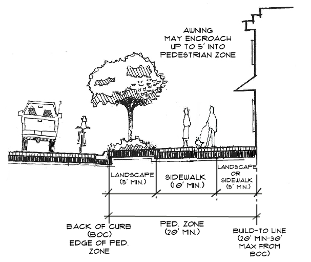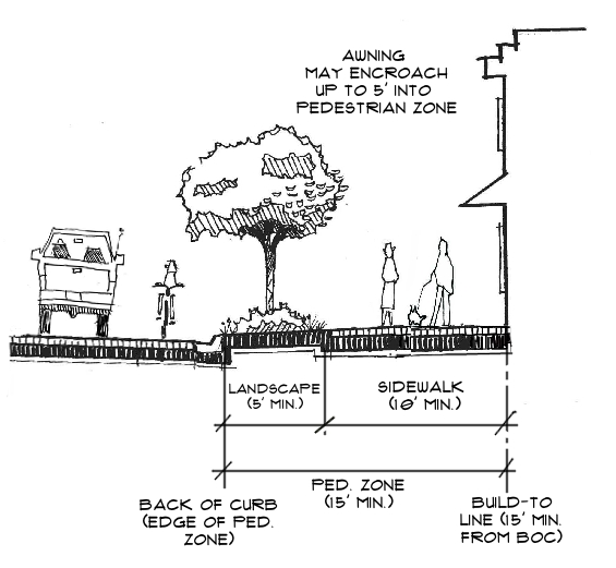 Landscape/Pedestrian Improvements - Landscape requirements are intended to recognize the urban nature of the downtown area. Accordingly, the landscape requirements are organized into the following categories: