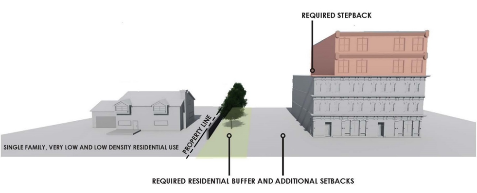 Along a property line shared with a property designated as either Residential Low or Residential Urban Future Land Use Map designation at the perimeter of the CRD; and