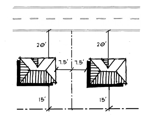 - Platted lots - Minimum building setbacks for the platted Sleepy Hallow lots are twenty (20) foot front, seven and a half (7.5) foot side, and fifteen (15) foot rear. The maximum height is twenty-five (25) feet, unless an additional five (5) foot side and rear is provided for each ten (10) feet (or one (1) story) above twenty-five (25) feet (see Figure 8-6).