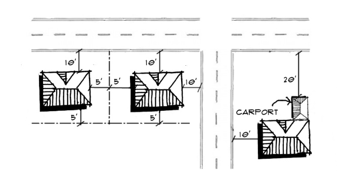 - Unplatted lots - Minimum building setbacks are ten (10) foot front, five (5) foot side, and five (5) foot rear. Corner lots require a ten (10) foot setback on both road frontages. The minimum garage or carport setback is twenty (20) feet, in to allow a car to be parked in the driveway and entirely on-site.