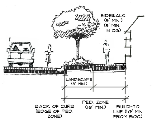 Curbside Landscaping/Utilities Area - The area between the back of street curb and the sidewalk in all Character Districts shall minimum of five (5) feet wide and contain: