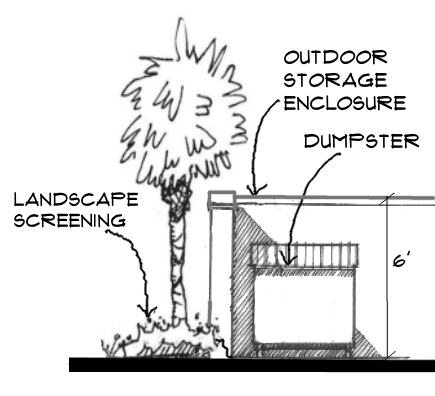 Streetscaping - Streetscaping involves the creation of a pedestrian friendly environment with adequate sidewalks, well-spaced canopy trees between the street curb and the sidewalk for shade, and low hedges of evergreen shrubs behind the sidewalk to soften building edges and help screen parking lots. Utilities (such as street lights) and street furniture (such as bus shelters, benches and trash cans) are also located in the area between the street curb and the sidewalk in order to separate vehicles from pedestrians and provide a safe, unobstructed walking area. Visibility of the buildings and site from the street is emphasized. Signs, usually monument signs, do not conflict with the higher growing canopy trees. As the trees grow, they can be limbed up, raising the canopy and keeping the building visible. Where outdoor dining is provided, no low growing vegetation at all is needed.