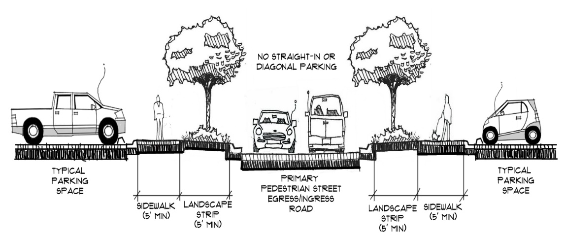 Connectivity - Well-defined, safe pedestrian access will be provided between building entrances and public sidewalks, transit stops, parking facilities, external sidewalks, and outparcel buildings. Pedestrian walkways shall be designed in a manner that reduces conflicts between the walkways and vehicular traffic. Public transit facilities shall be provided using landscaped areas, sidewalks, and pavement markings or pavers when crossing vehicular use areas.