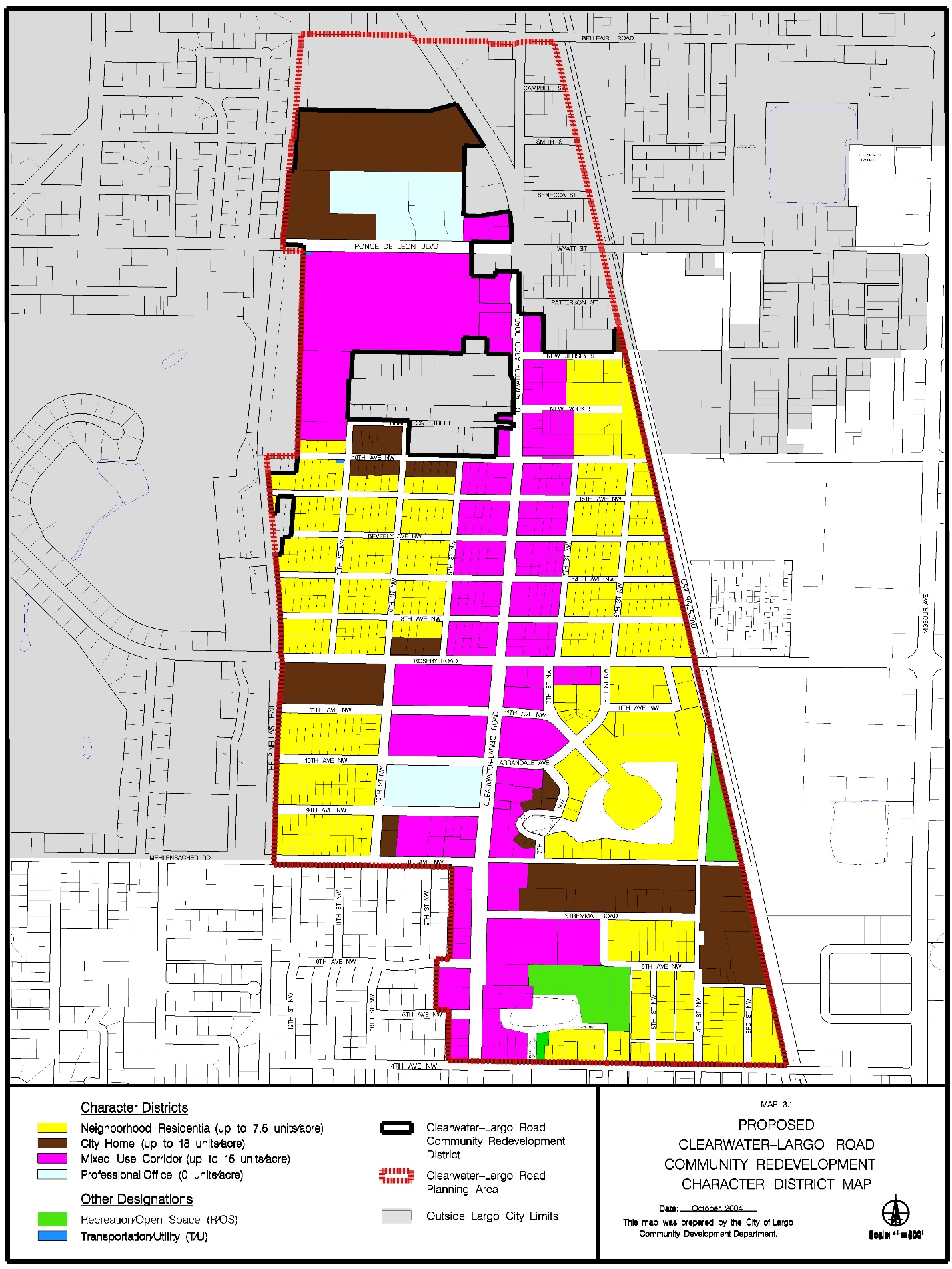 Location and boundaries - The Downtown Largo Multimodal Activity Center encompasses the West Bay Drive Community Redevelopment District (WBD-CRD); the Clearwater-Largo Road Community Redevelopment District (CLR-CRD); the Missouri Avenue corridor and adjacent areas between the CRD boundaries to the west and south, Auburn Street to the north, and 4th Street NE to the east; and the area south of 4th Avenue SW, west of Central Park Drive, north of 8th Avenue, and east of the Pinellas Trail, as indicated by Map 7-1.