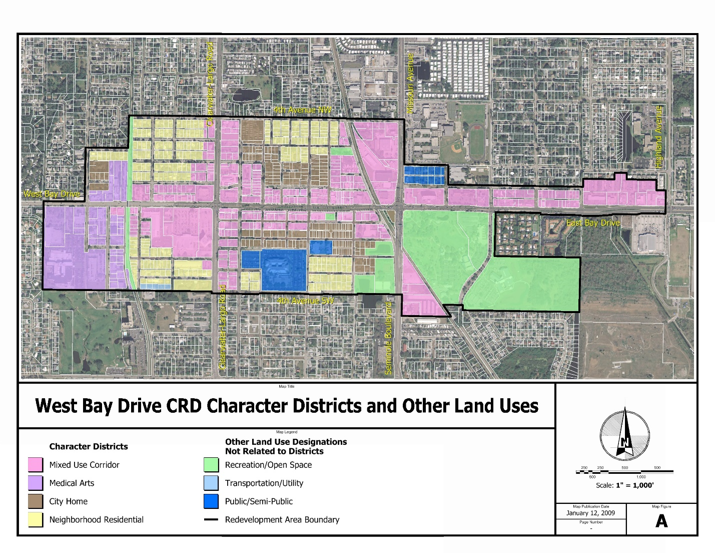 Land use designations within the CRDs - In both the CLR-CRD and the WBD-CRD, overlay districts have been created as part of the land use designation of Community Redevelopment District. These are called "Character Districts" and represent areas within the Districts targeted for redevelopment opportunities. In addition, other land use designations found under Section 6.2, exist within the CRDs and represent areas which must be protected and are not currently considered as redevelopment opportunities. Character Districts and other land use designations are shown for each CRD on Map 7-3 Clearwater Largo Road CRD Character District Map, and Map 7-4 West Bay Drive CRD Character District Map.