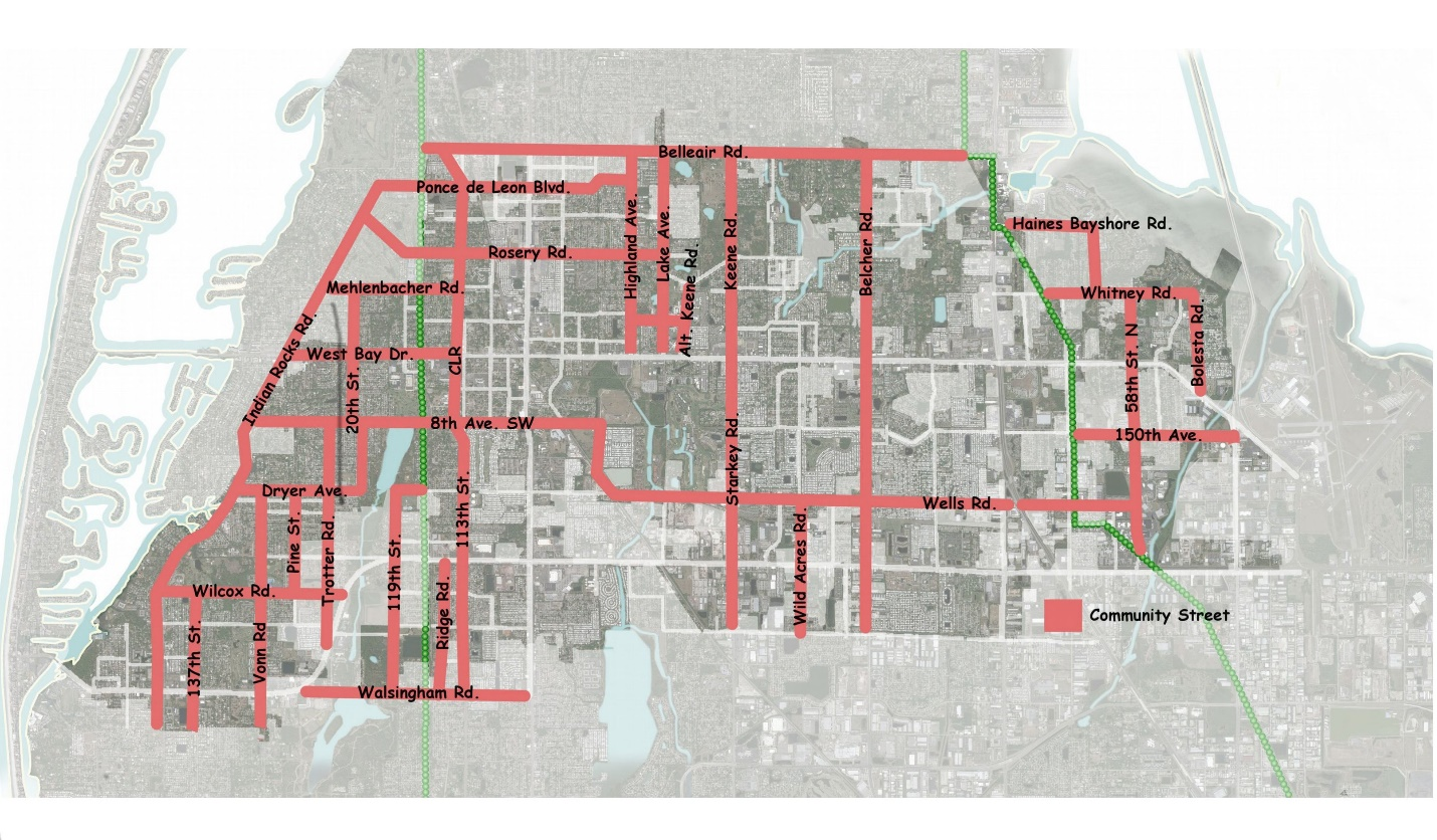 Location - The Strategic Plan identifies East/West Bay Drive, Roosevelt Boulevard, Ulmerton/Walsingham Road, Missouri/Seminole Boulevard, and 66th Street as sprawling strip commercial corridors that should be redeveloped into mixed-use corridors over time. Development along these corridors should contain a mixture of complimentary/supportive uses, such as a combination of residential, office, and commercial uses. These uses should support all modes of transportation (automobile, bicycling, walking, and mass transit).