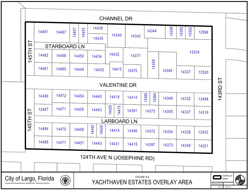 Purpose and area - This Section implements recommendation of the Yachthaven Estates Neighborhood Plan developed through a collaborative neighborhood planning process and adopted by the City Commission on April 15, 2003. The Yachthaven Estates Neighborhood overlay area comprises all seventy-three (73) residential lots bounded to the north by Channel Drive, the south by 124th Avenue North, the west by 145th Avenue North, and the east by 143rd Avenue North. This area is shown in Map 7-8.