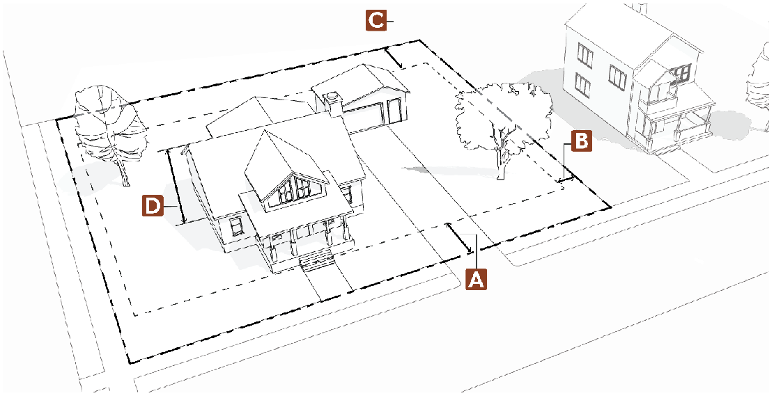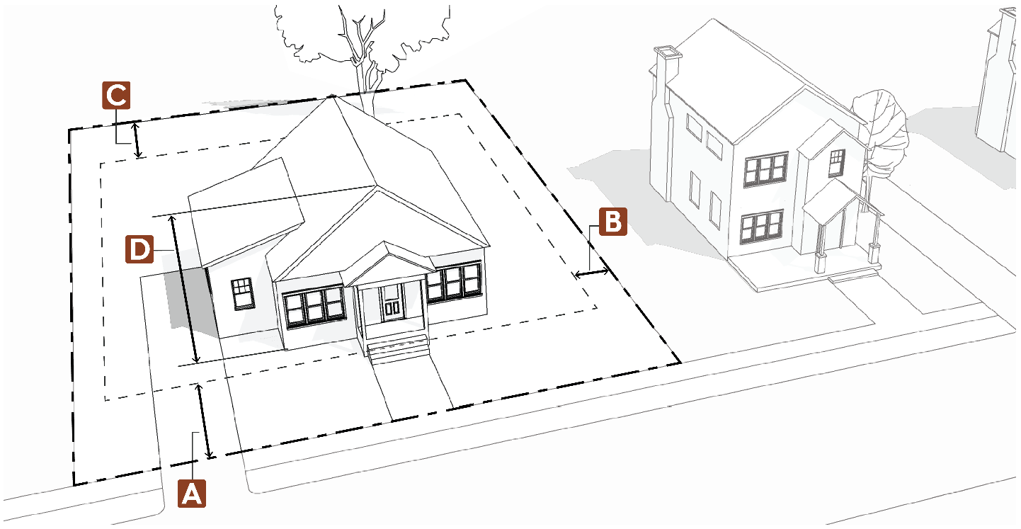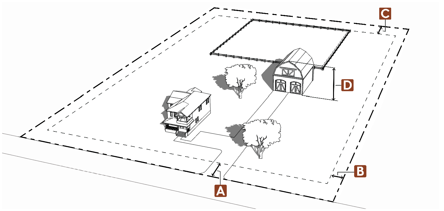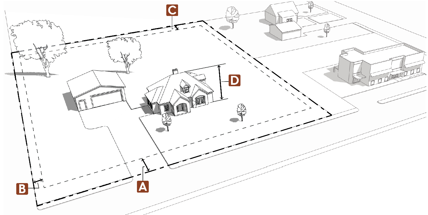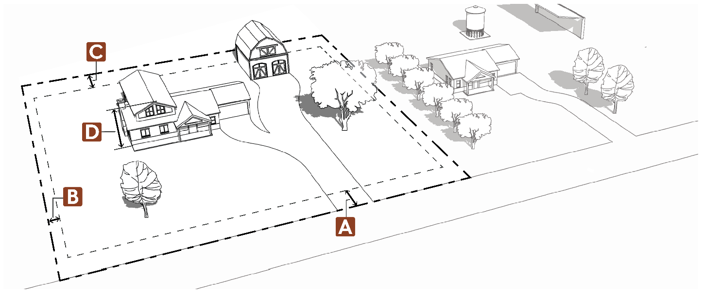 All structures must maintain a distance of five feet from all lot lines. Structures may be located outside of a building envelope unless restricted to the building envelope as a part of an approved development. No part of any structure may extend into or above any easement.