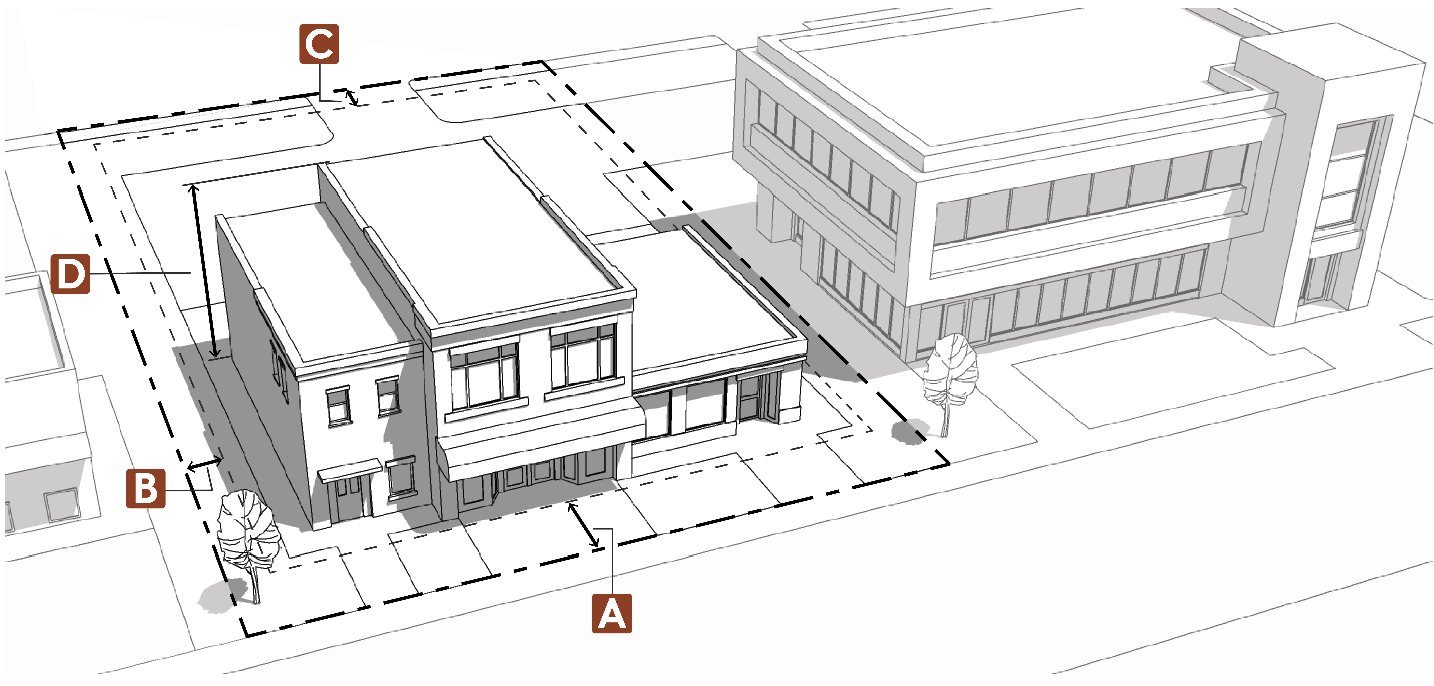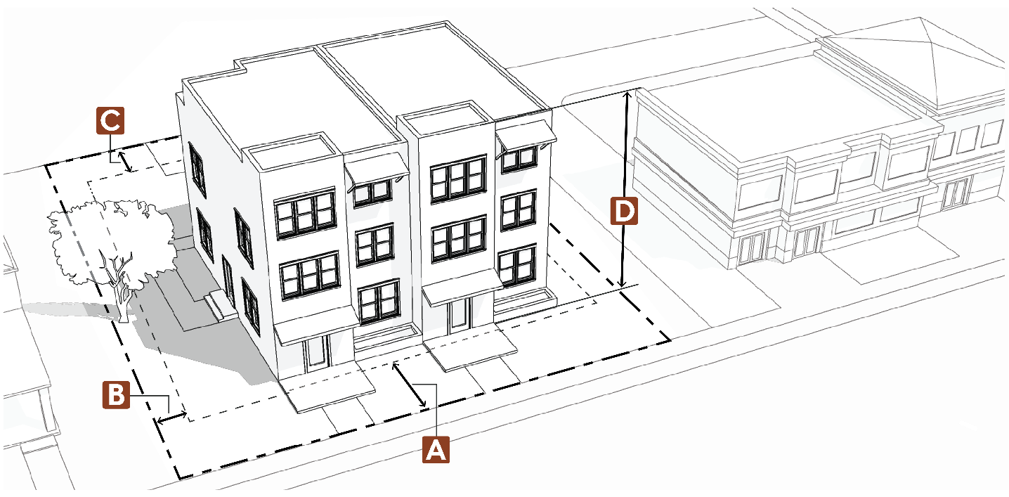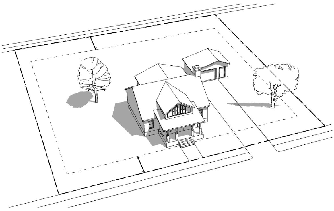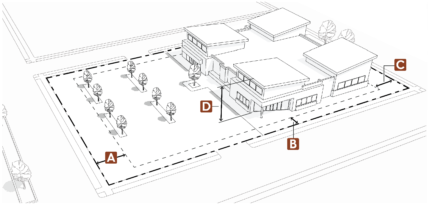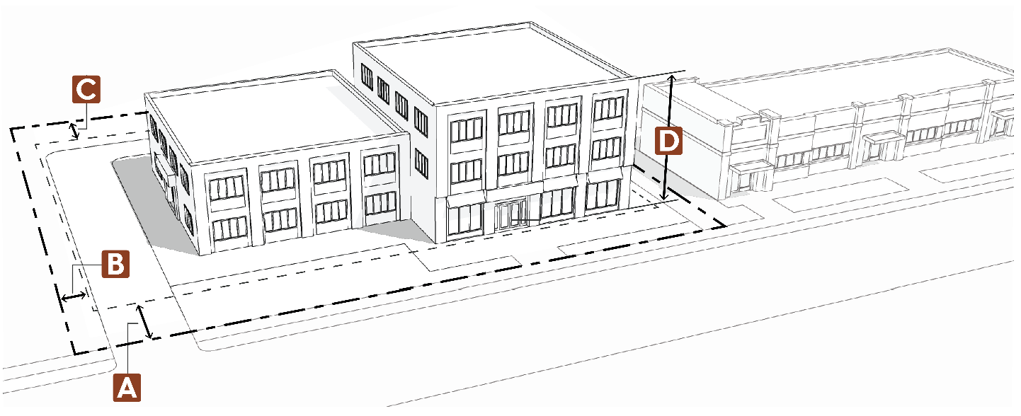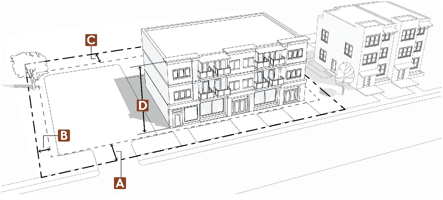 For each base zoning district, an illustration depicts the general layout of the zoning districts within that character area. Illustrations do not depict specific locations or buildings and do not necessarily reflect all the standards that may apply to a particular development. If a standard shown in an illustration is inconsistent with the respective table of lot and building standards or other text in this Code, the standards in the table and text of this Code shall govern.