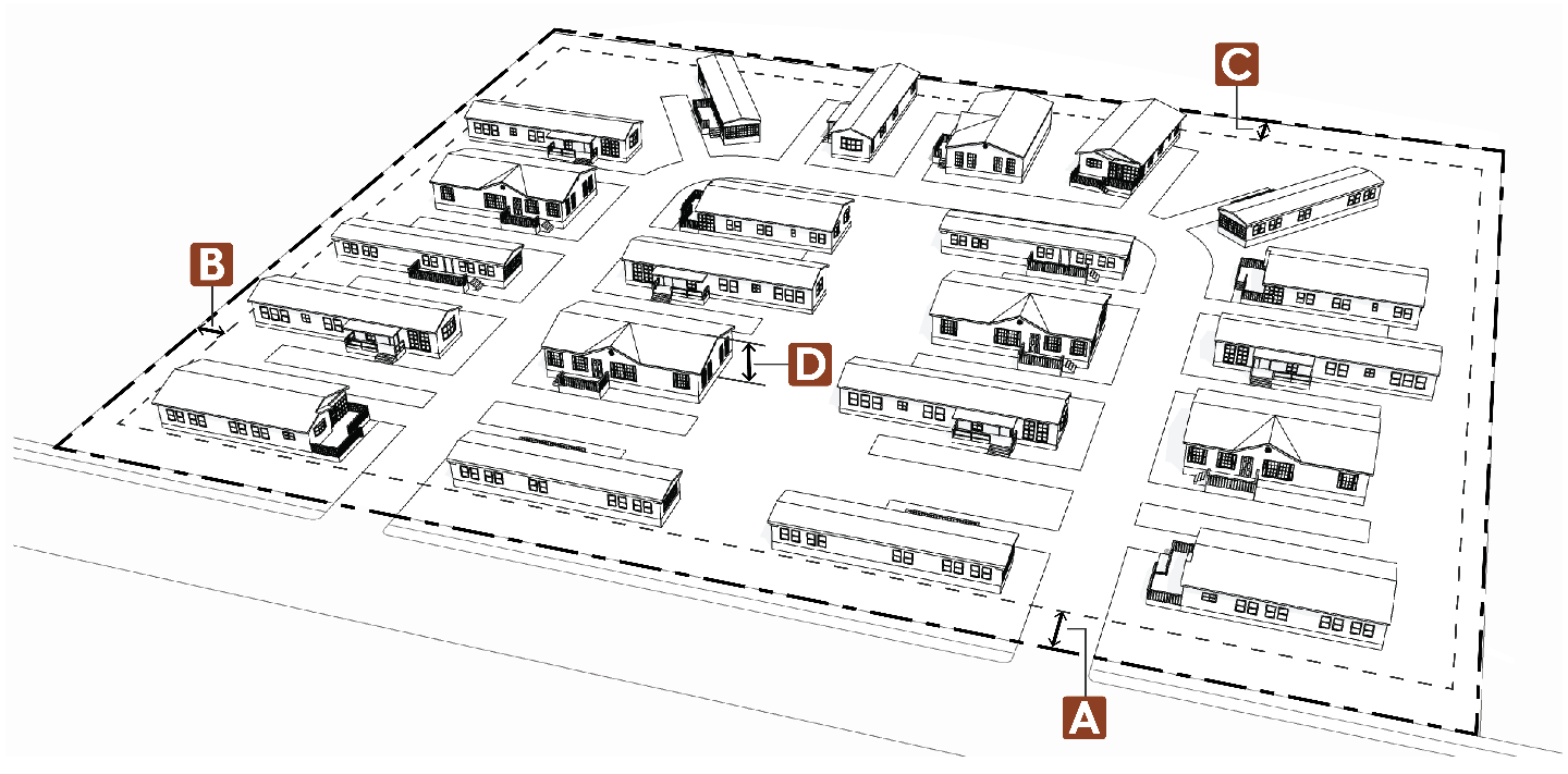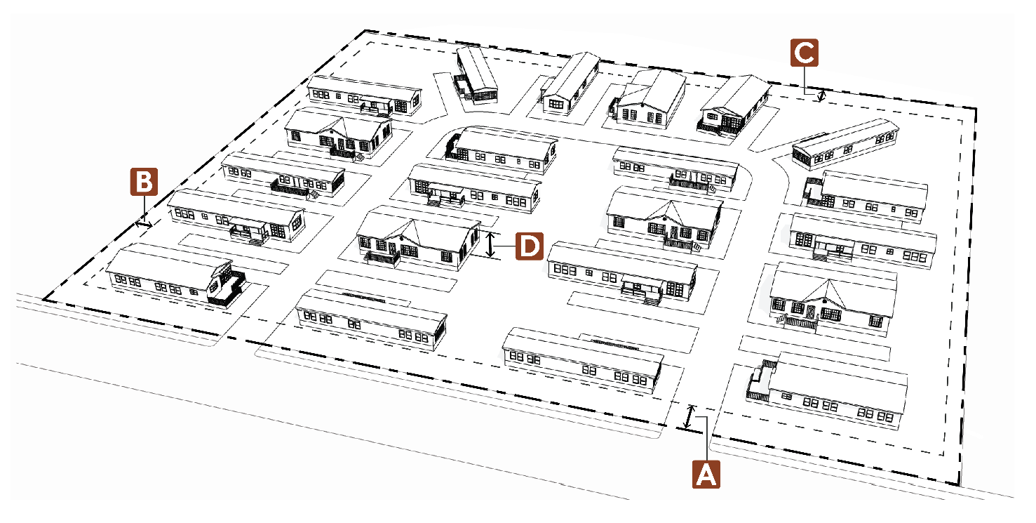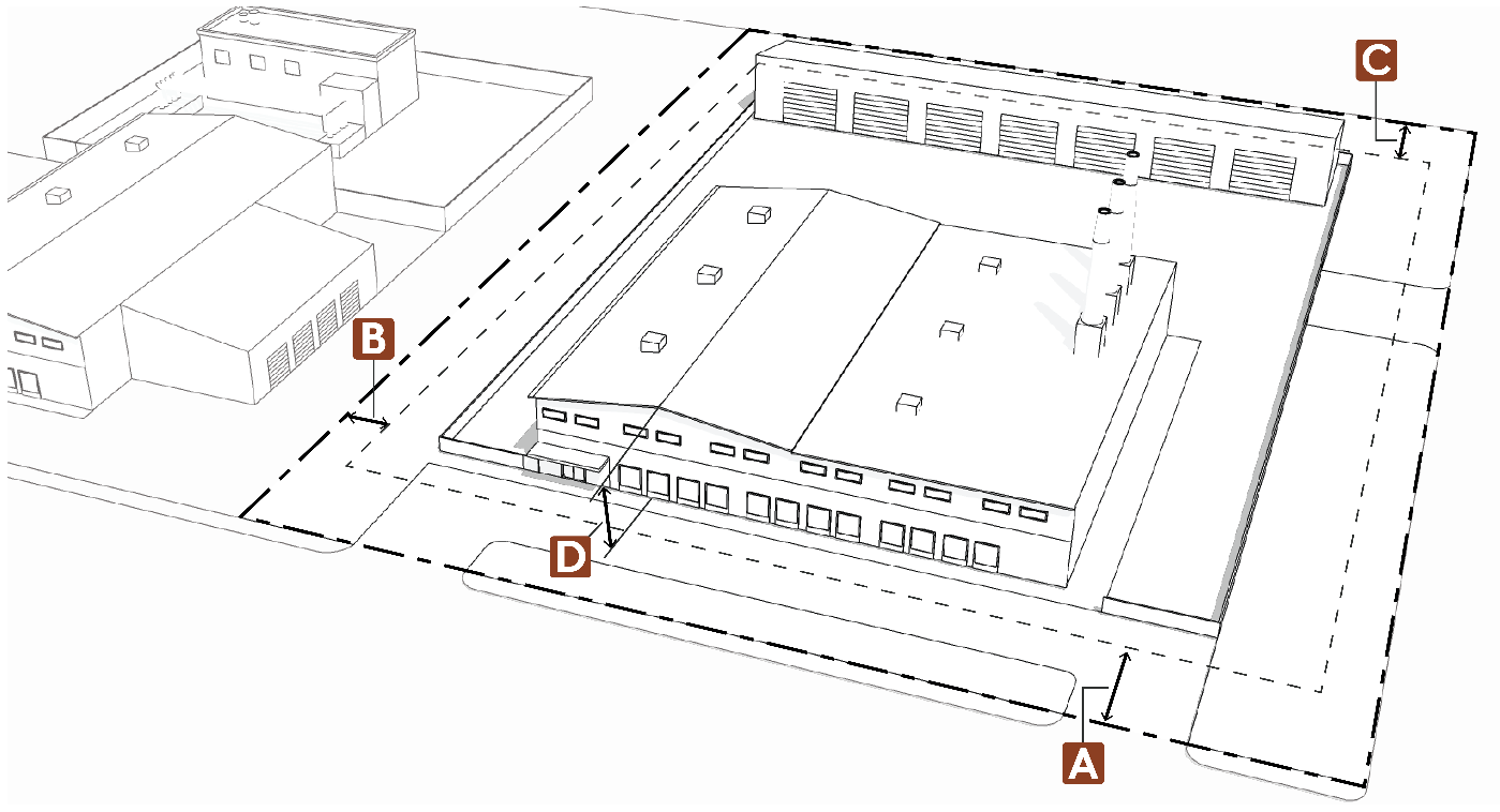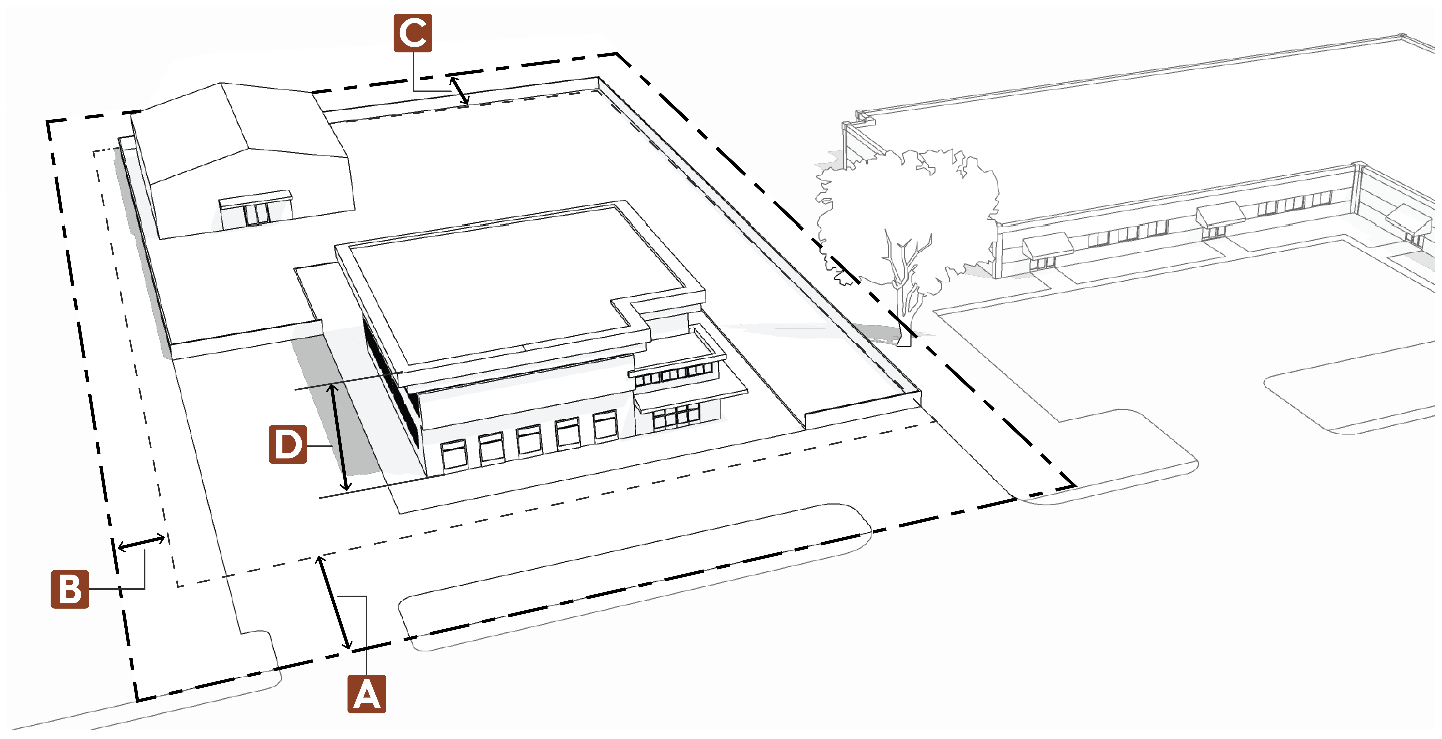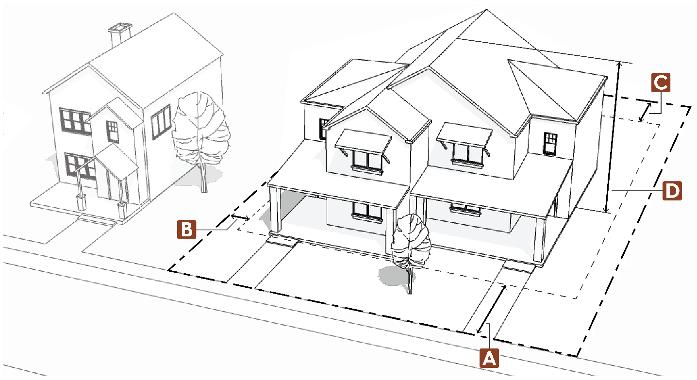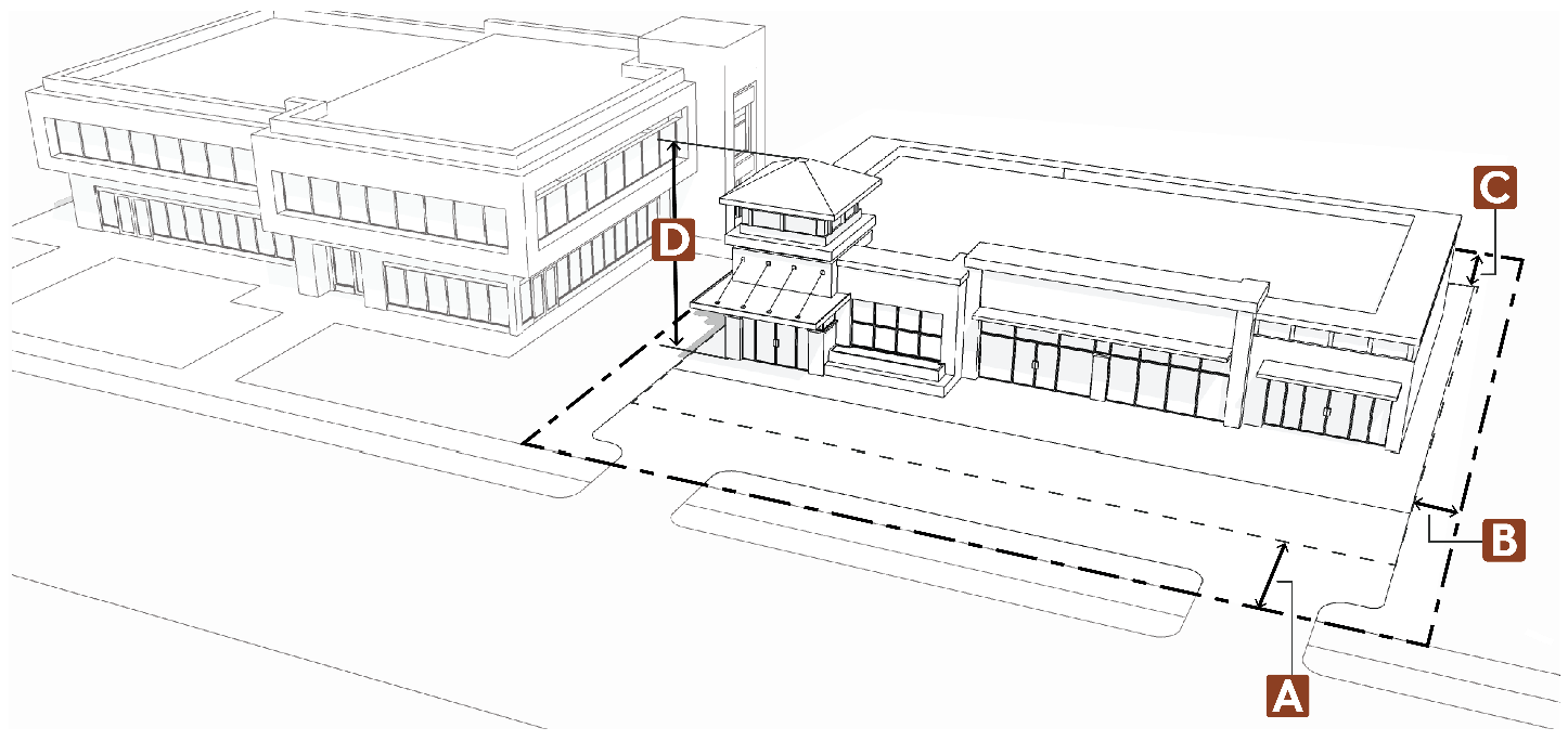 For each base zoning district, an illustration depicts the general layout of the zoning districts within that character area. Illustrations do not depict specific locations or buildings and do not necessarily reflect all the standards that may apply to a particular development. If a standard shown in an illustration is inconsistent with the respective table of lot and building standards or other text in this Code, the standards in the table and text of this Code shall govern.