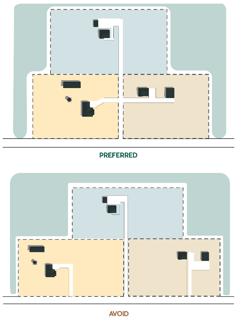 In Conservation and Agriculture and Rural districts, the placement of buildings within building envelopes along the street frontage should be varied to minimize uniformity.