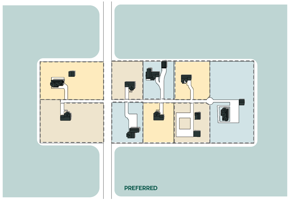 Lots should be sited in areas deemed compatible with the special characteristics of the specific parcel under consideration as well as surrounding areas. Lot sizes and spacing will depend on the specific site and technical and environmental factors.