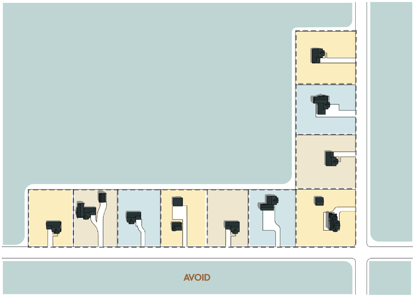 Lot layouts should provide desirable settings for structures by using natural contours, maintaining desirable views, and providing protection from adverse wind, noise, and vehicular traffic.