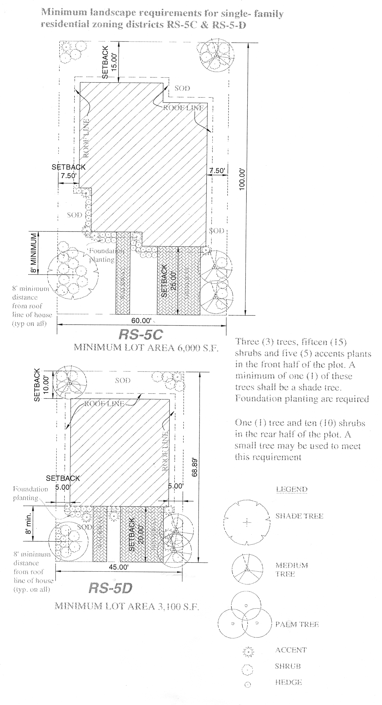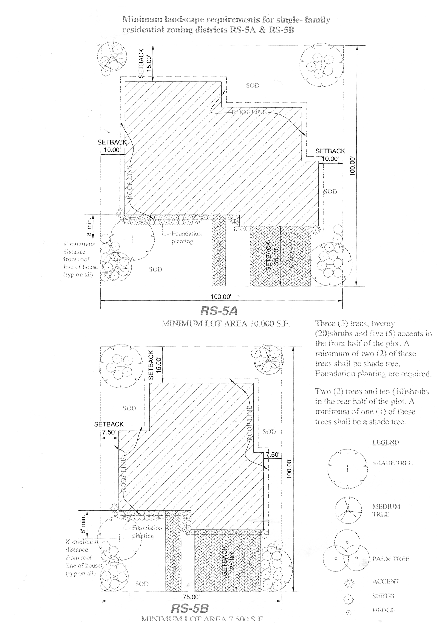 Two trees and ten shrubs in the rear half of the plot. A minimum of one of these trees shall be a shade tree. All RS-5A and RS-5B properties shall comply with these regulations by December 30, 2008.