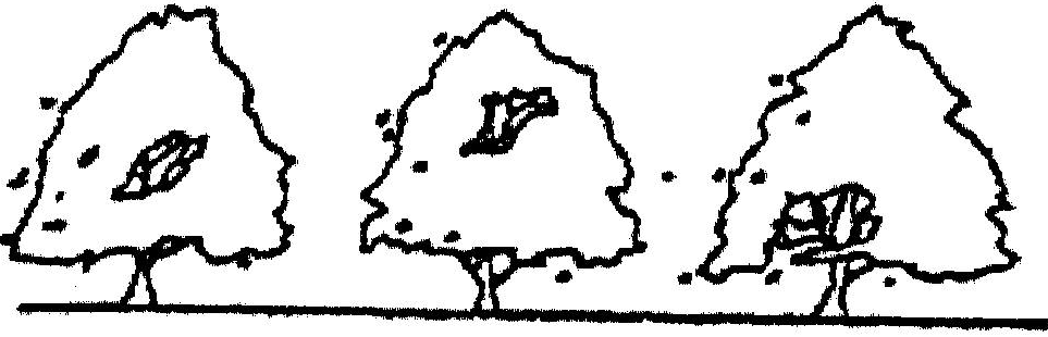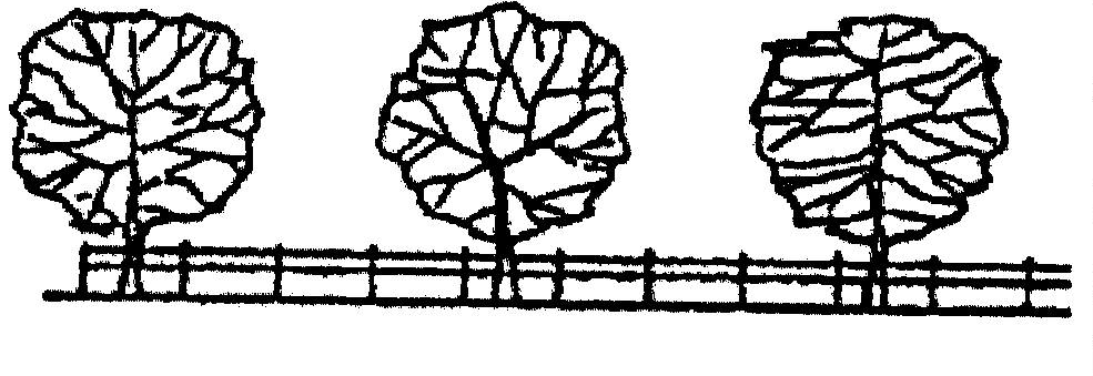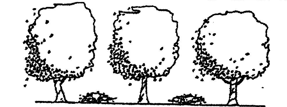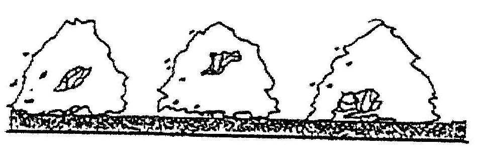 Broken screen, Type C: A screen composed of intermittent visual obstructions from the ground to a height of at least twenty (20) feet. The broken screen is intended to create the impression of a separation of spaces without necessarily eliminating visual contact between the spaces. It may be composed of a wall, fence, landscaped earth berm, planted vegetation, or existing vegetation. Planted trees shall be at least three (3) feet in height at planting. Suggested planting patterns which will achieve this standard are illustrated below: